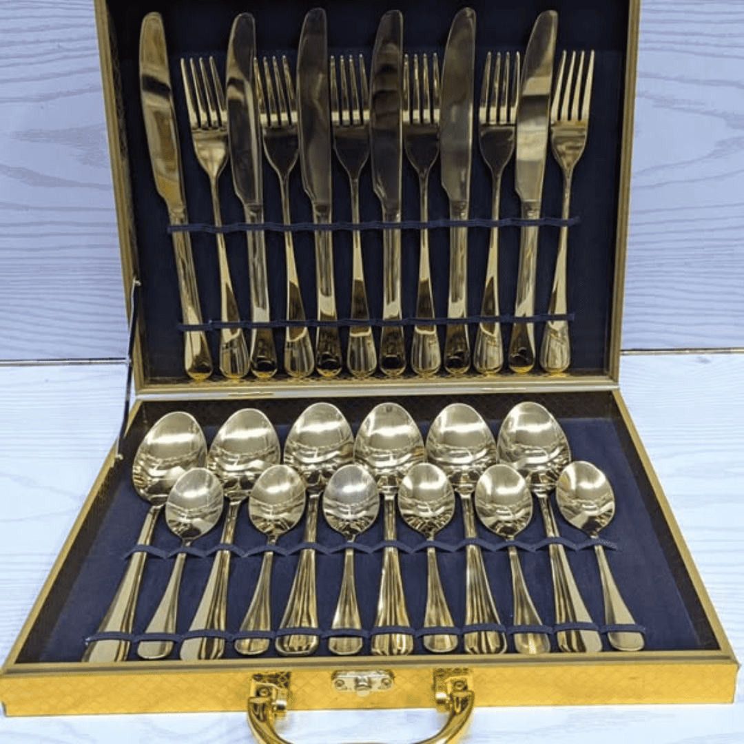 Add luxury and convenience to your dining with the 24Pcs Gold Cutlery Set with Briefcase, a premium collection that combines style and storage. Made from stainless steel with a stunning gold finish, this set includes a portable briefcase that makes it perfect for gifting, storage, or travel.