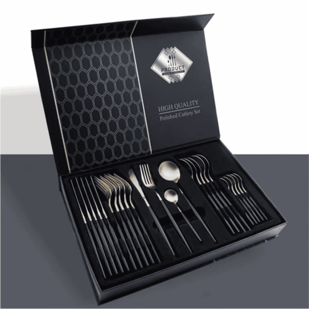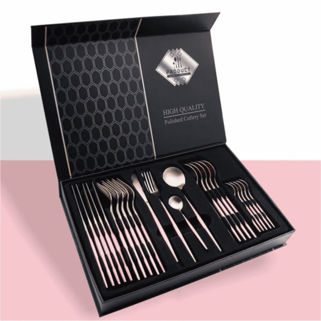 The 24Pcs Stainless Steel Golden Cutlery Set offers a modern twist on classic flatware. Available in elegant color variations including black gold, green gold, pink gold, and red gold, this set allows you to personalize your dining table with a touch of style.