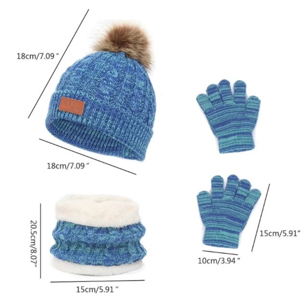 The 3 in 1 Winter Kids Beanies Hat Scarf and Gloves Set is the ultimate winter wardrobe upgrade for active children. This complete 3-piece set includes a beanie, scarf, and gloves, all coordinated to provide a polished and cozy look. The 3 in 1 Winter Kids Beanies Hat Scarf and Gloves Set is made from soft knitting thread with a warm acrylic fiber lining, providing double-layer protection against harsh winter weather. It is specifically designed to trap heat effectively while allowing for a comfortable, flexible fit.