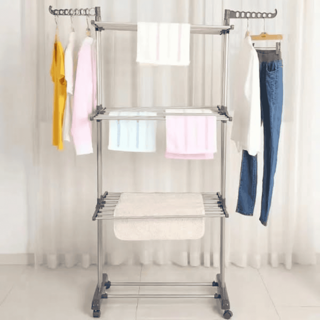 Make laundry days more efficient with the 3 Layer Portable / Movable Cloth Drying Rack. Designed for convenience and practicality, this drying rack is the perfect solution for households looking to save space while drying clothes. Its three-tier structure offers ample drying space, making it suitable for everything from daily wear to bed linens and towels.
