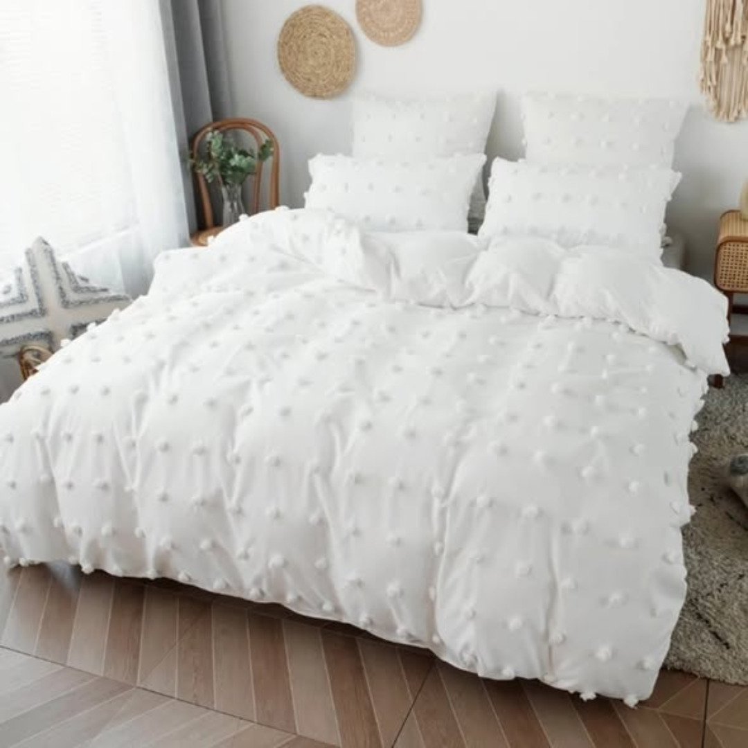 Experience the height of comfort and style with the 3 pcs set duvet cover, designed to turn your bedroom into a luxurious retreat. This 3 pcs set duvet cover is manufactured from soft luxurious microfiber fabric, which is celebrated for its breathable yet cozy feel. Microfiber is naturally resistant to wrinkles and fading, ensuring that your bed always looks crisp and inviting with minimal effort. The chic dot design adds a subtle, modern texture to the White fabric, providing a clean and sophisticated aesthetic that complements any interior decor style, from minimalist to classic.
