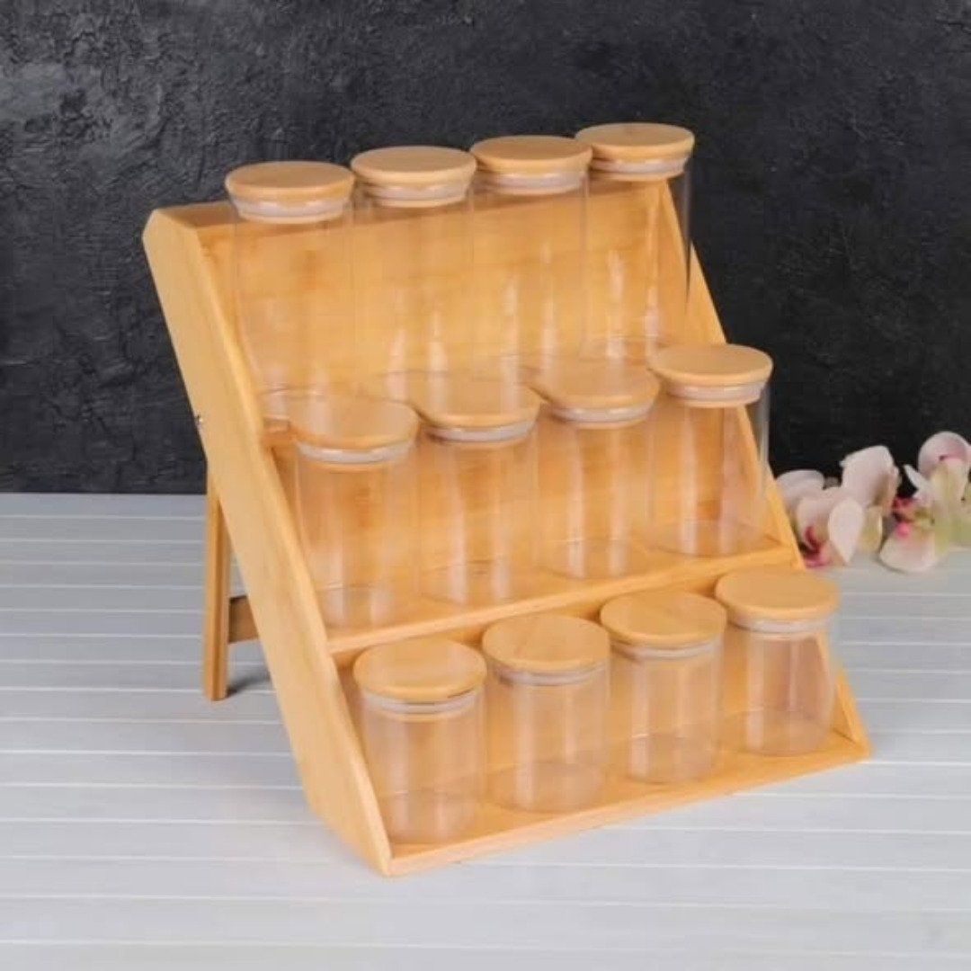Complete Set: Includes 1 bamboo rack and 12 pcs airtight glass spice jars with bamboo lids.