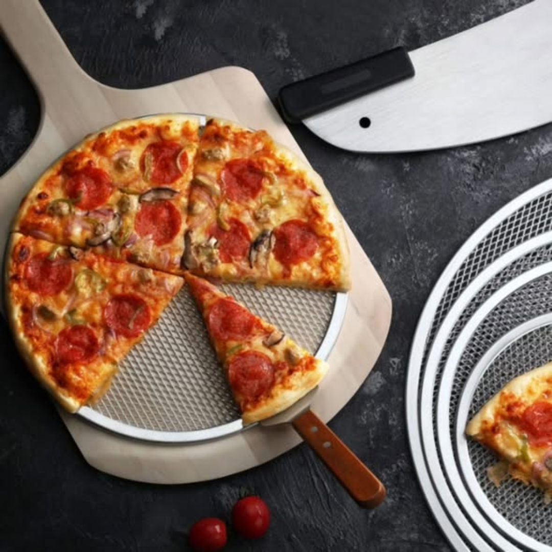 The 3pcs aluminium mesh pizza trays set is a must-have for any home pizza chef who strives for that perfect, restaurant-quality “crispy crust.” This comprehensive set includes three essential sizes—14 inch, 11 inch, and 10 inch—allowing you to bake everything from large family pizzas to individual personal pies. The “aluminium mesh” design is the secret to a professional bake; the open weave allows hot air to circulate directly around the bottom of the dough, ensuring an even cook and preventing the “soggy bottom” often caused by solid baking sheets.