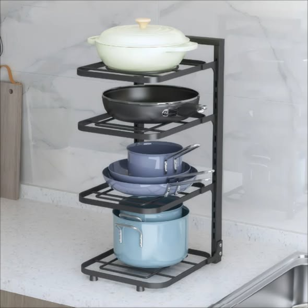 Four-Tier Vertical Storage: Efficiently utilizes vertical space to hold multiple pots, pans, and lids simultaneously.