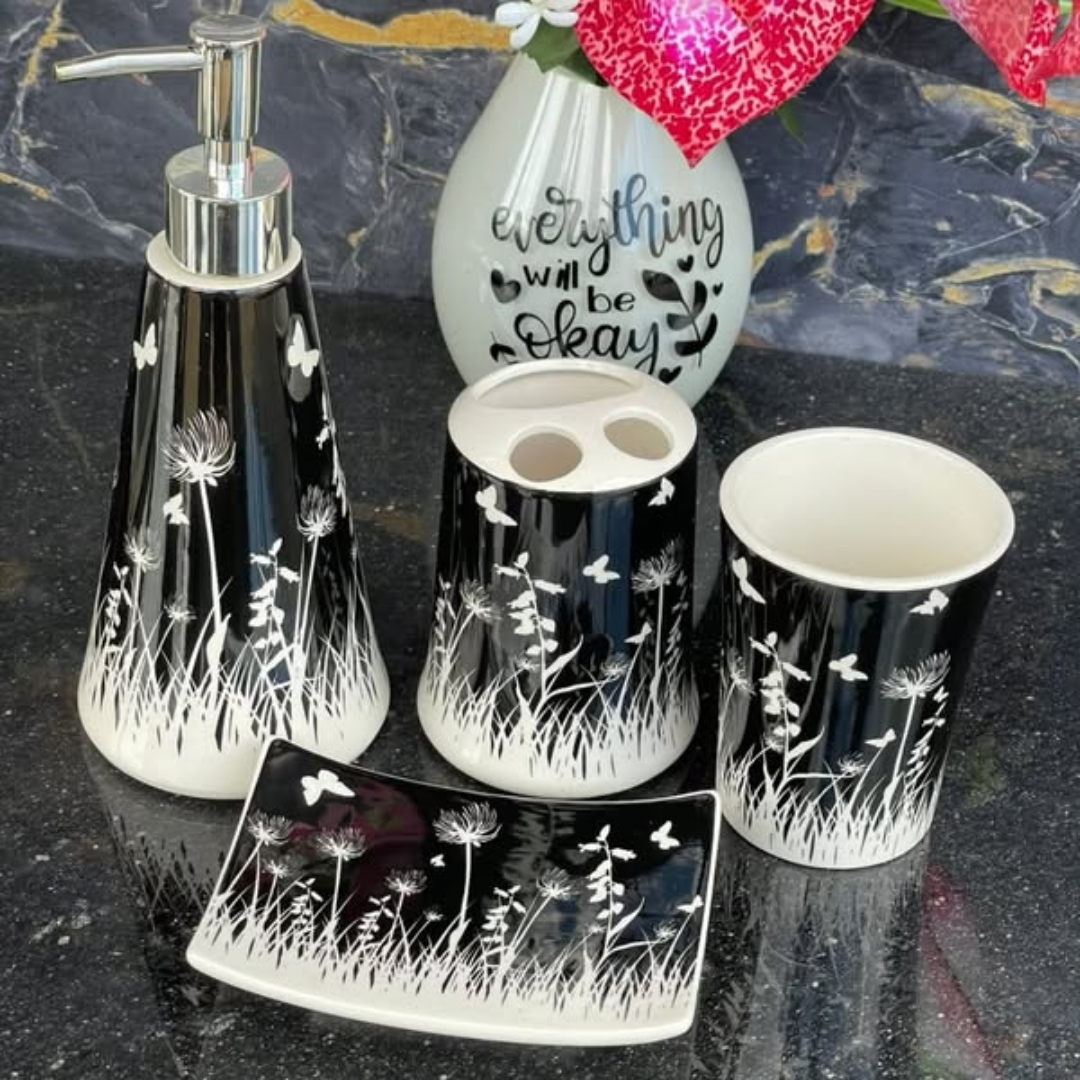 Complete set: Includes water glass, soap dispenser, soap dish, and toothbrush holder.