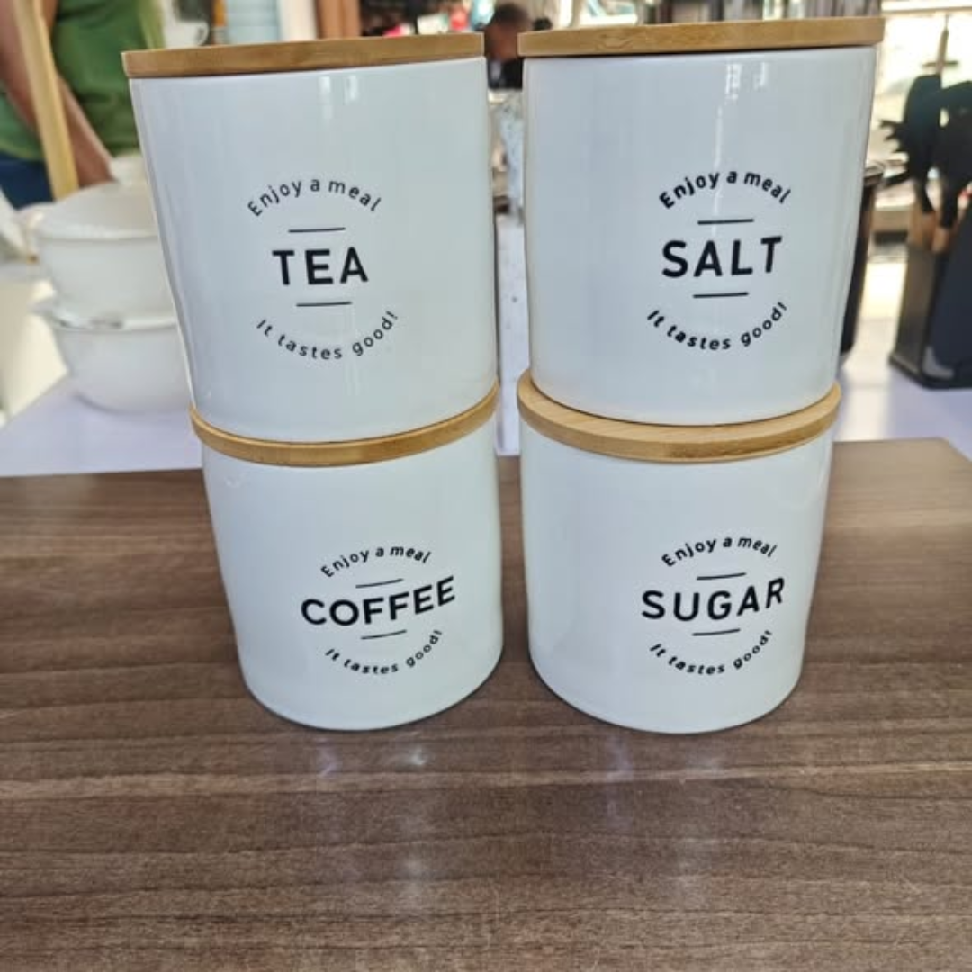 Complete 4-Piece Collection: Specifically labeled for Salt, Sugar, Tea, and Coffee.
