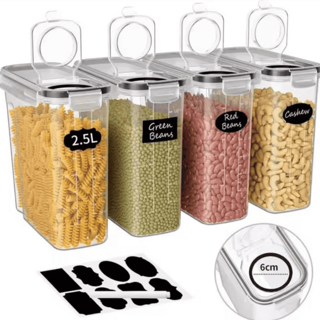 Simplify your food storage with the 4pcs Airtight Food Storage Containers, designed for freshness, durability, and convenience. Each container has a generous 2.5-liter capacity, making them perfect for storing cereals, pasta, grains, snacks, and baking ingredients. With airtight lids, they protect food from moisture, insects, and air, keeping everything fresher for longer.