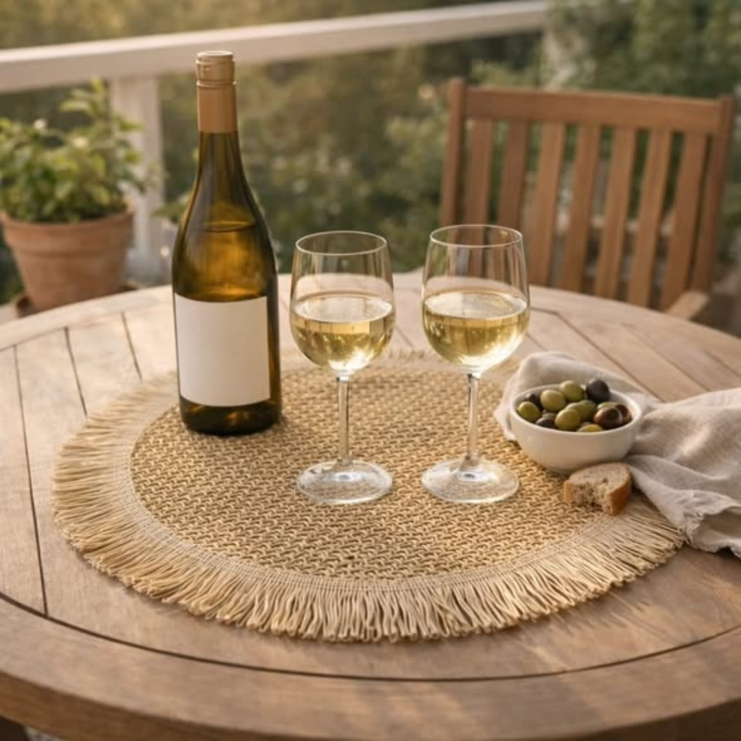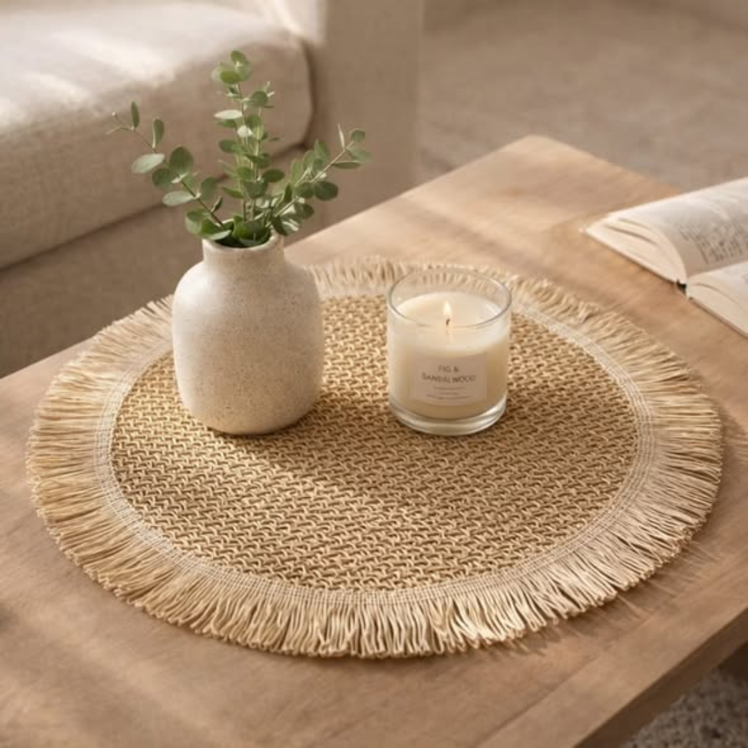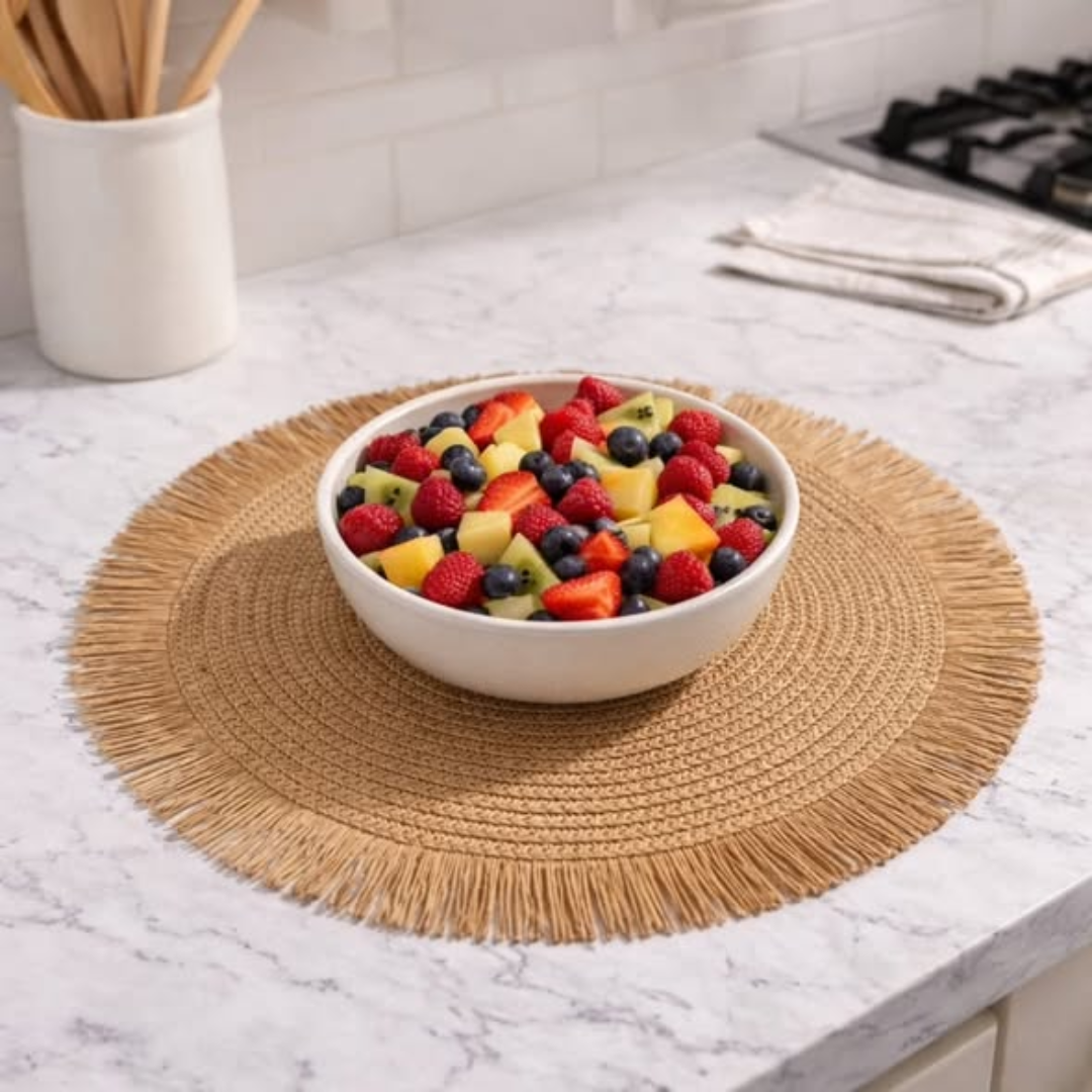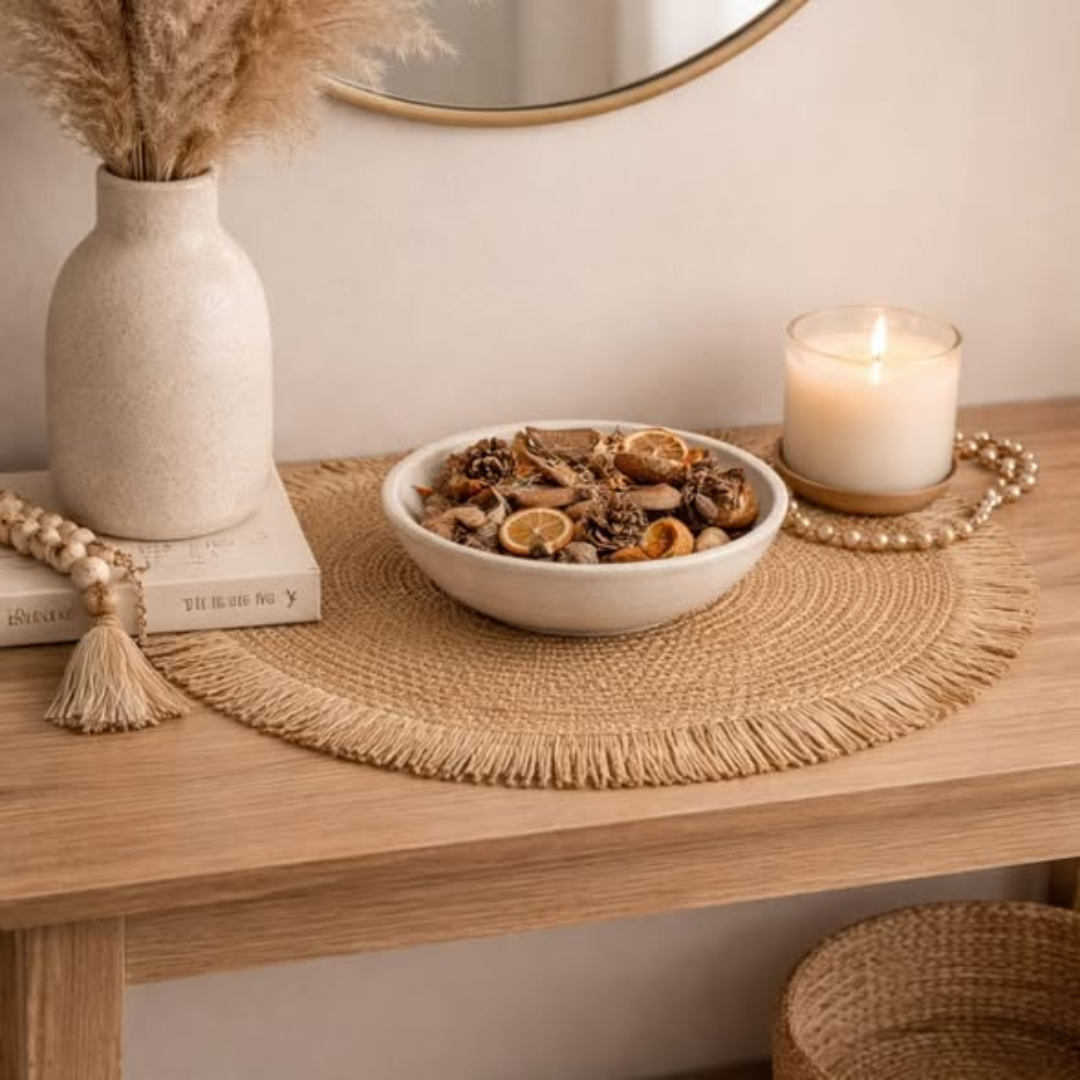 The 6PCS Round Jute Table Mat set is an eco-friendly and stylish dining accessory that brings a rustic, natural charm to your table setting. This 6PCS Round Jute Table Mat set includes six matching mats, each with a 38cm diameter—the perfect size to accommodate large dinner plates, bowls, and cutlery. Hand-braided from high-quality natural jute fibers, these mats are not only biodegradable but also incredibly durable and heat-resistant. They provide a sturdy protective barrier for your tabletop against scratches, heat marks, and spills, ensuring your dining furniture stays in top condition while looking beautifully curated.