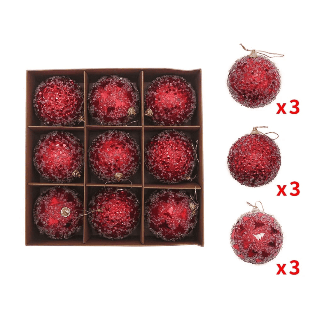 The 9pcs set high quality Christmas ball collection brings elegance, durability, and festive charm to your Christmas tree decorations. With a size of 8 cm, these ornaments provide the perfect accent to trees of various heights. Each piece features premium craftsmanship and colours as displayed, giving your holiday setup a polished and visually appealing finish.