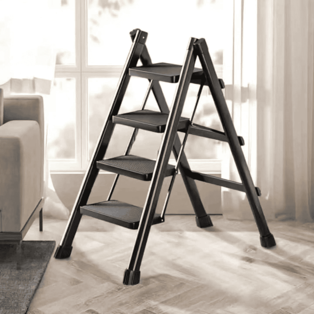 The sleek black finish adds a modern touch, making it not only practical but also stylish enough to keep in any environment. Unlike traditional bulky ladders, this foldable stepper ladder combines functionality with a neat appearance.