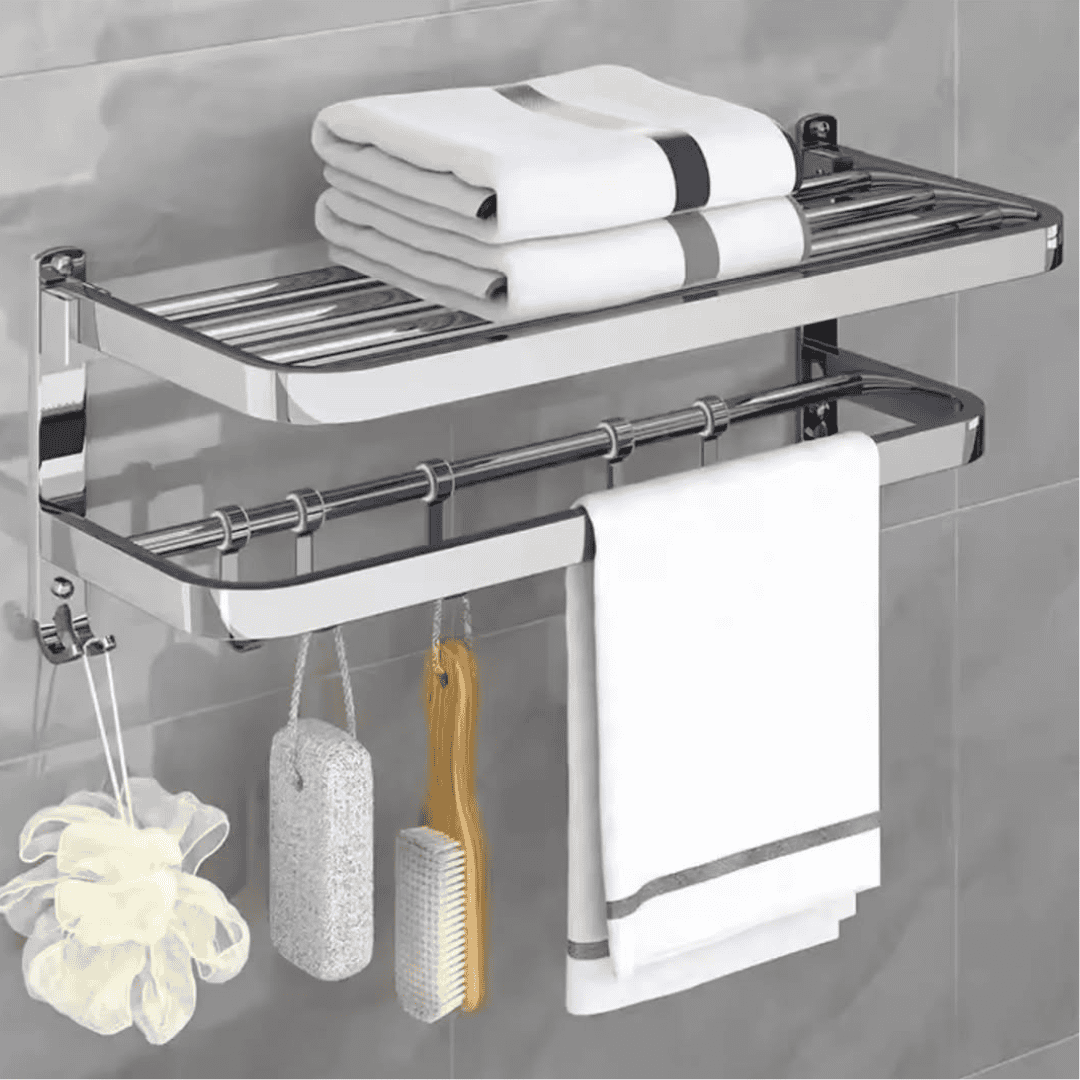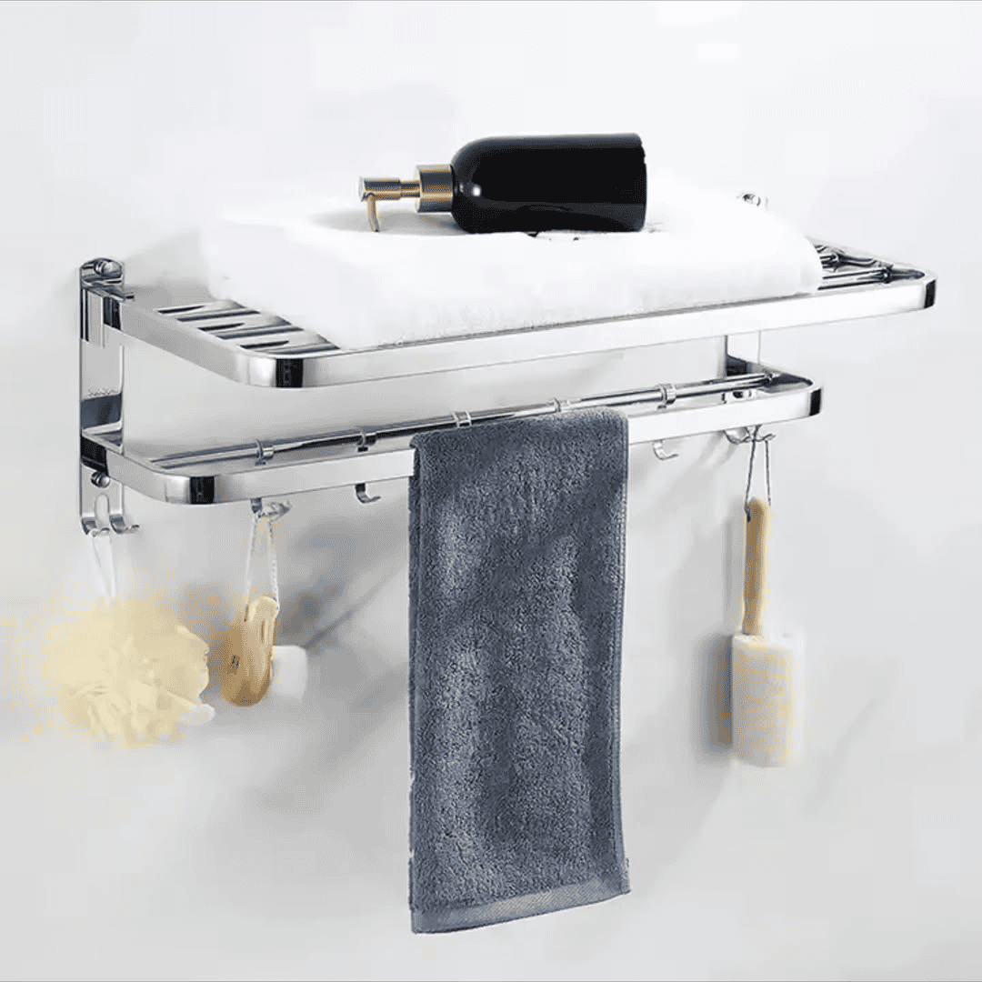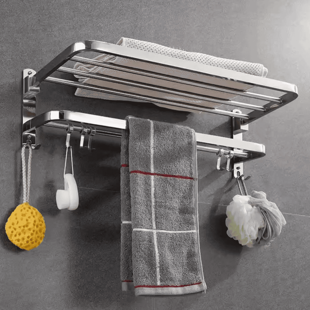 Crafted from premium 304 stainless steel, this towel rack boasts exceptional strength and durability. Its double-layer design offers generous space for towels and clothes, while the integrated hooks make it ideal for hanging loofahs, robes, or washcloths. Its foldable structure adds a layer of flexibility — fold it away when not in use to save space.