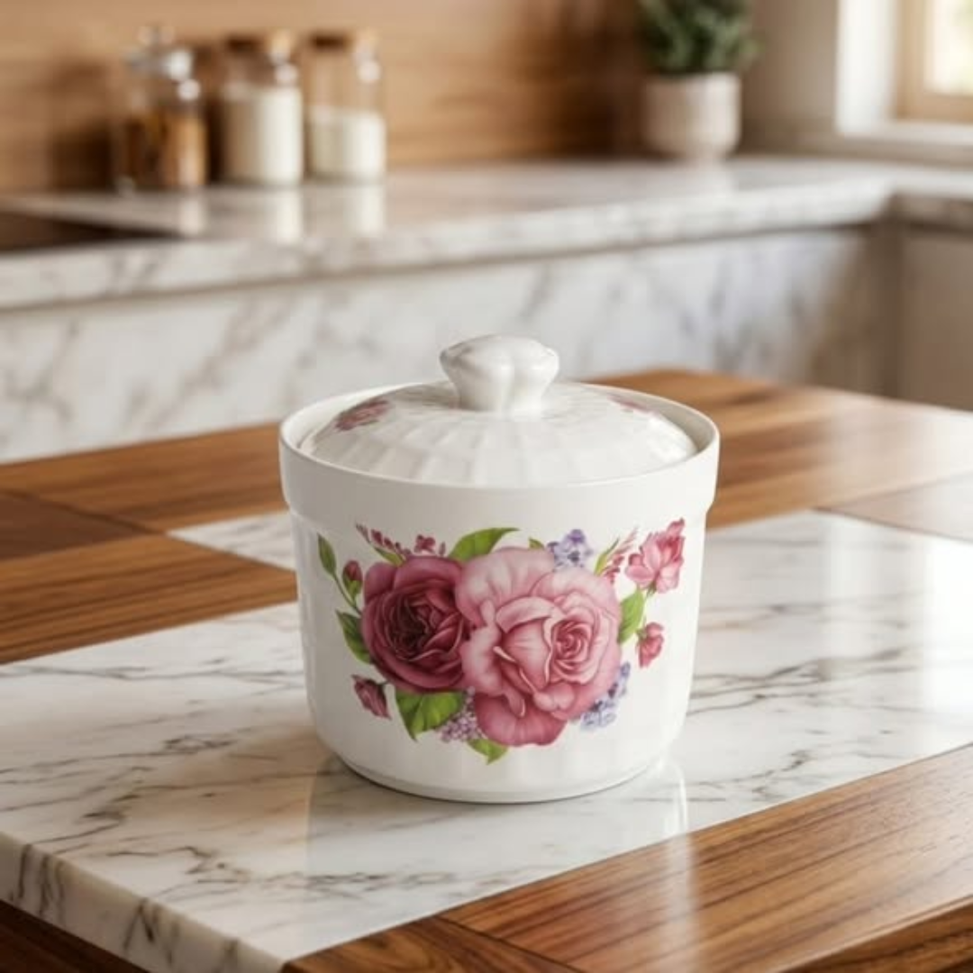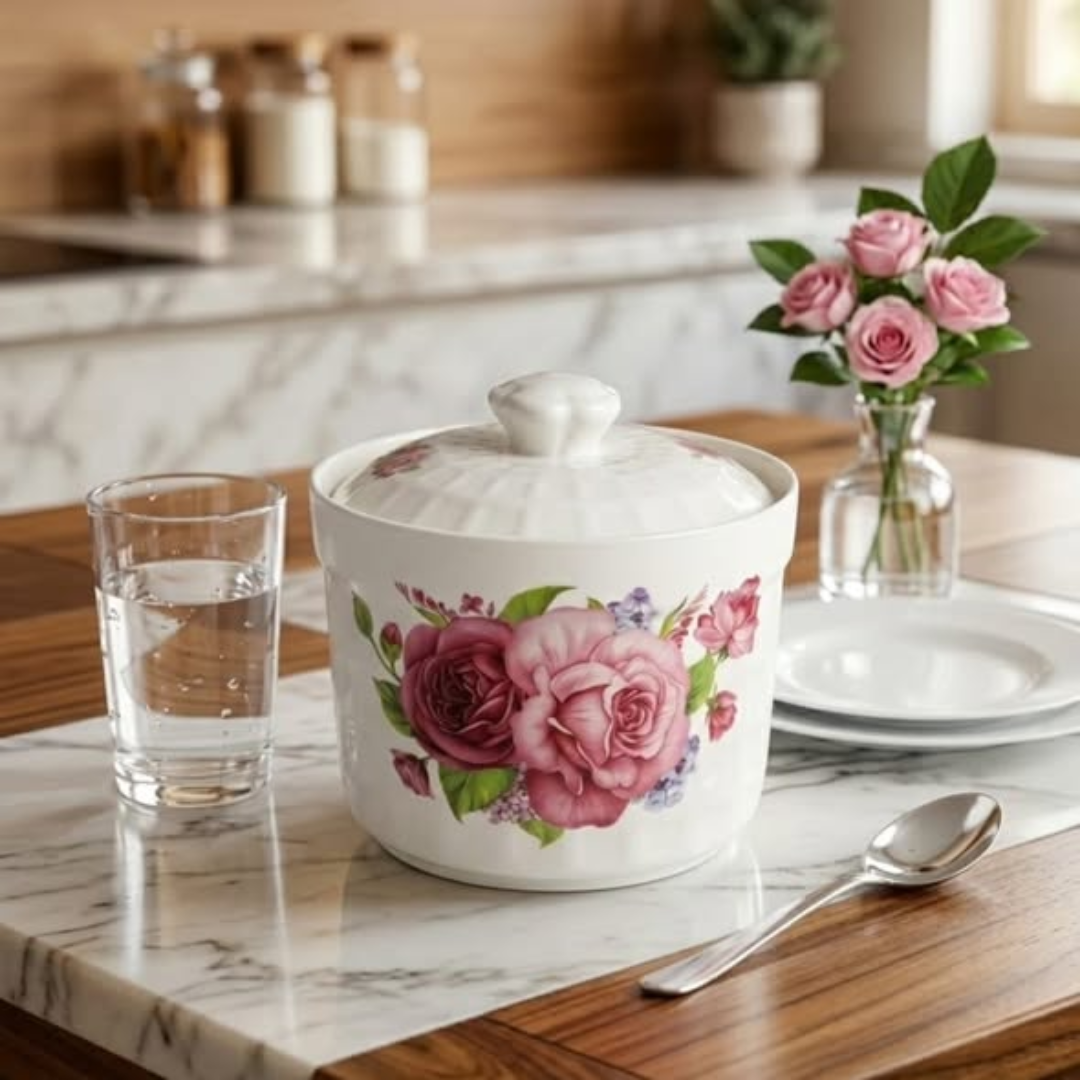 Crafted from durable ceramic, this pot features a stunning floral design that adds charm to any table setting. It comes with a matching lid that helps retain heat and keeps contents fresh. Despite its elegant look, it is designed for everyday use and is easy to clean and maintain.