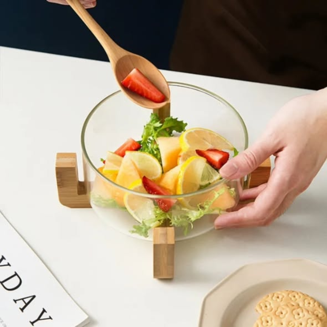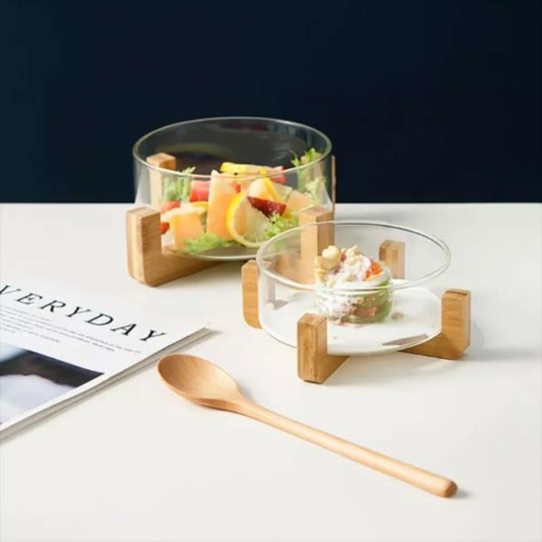 The inclusion of the wooden base with the Borosilicate Glass salad bowl provides a stunning visual contrast between the crystal-clear glass and the natural grain of the wood. This base not only adds a touch of organic warmth but also provides a stable, non-slip platform that protects your tabletop from heat or moisture. With its wide-mouth design and deep capacity, the bowl is perfect for tossing large family-sized salads, serving fruit medleys, or displaying decorative items in your living room. The non-porous nature of the glass ensures that it will never absorb food odors or stains, keeping your presentations fresh and appetizing every time.