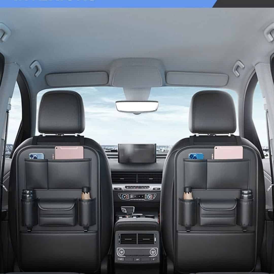 The Car Back Seat Storage Bag is an upgraded multi purpose organiser designed to keep your vehicle interior tidy and functional. Made from high quality leather material, this back seat storage bag combines durability with a luxury look, while providing multiple pockets and holders for everyday travel needs. It attaches securely to the back of the front seats with sturdy hooks and adjustable straps, creating instant storage for passengers and drivers who want better organisation and protection from mess.