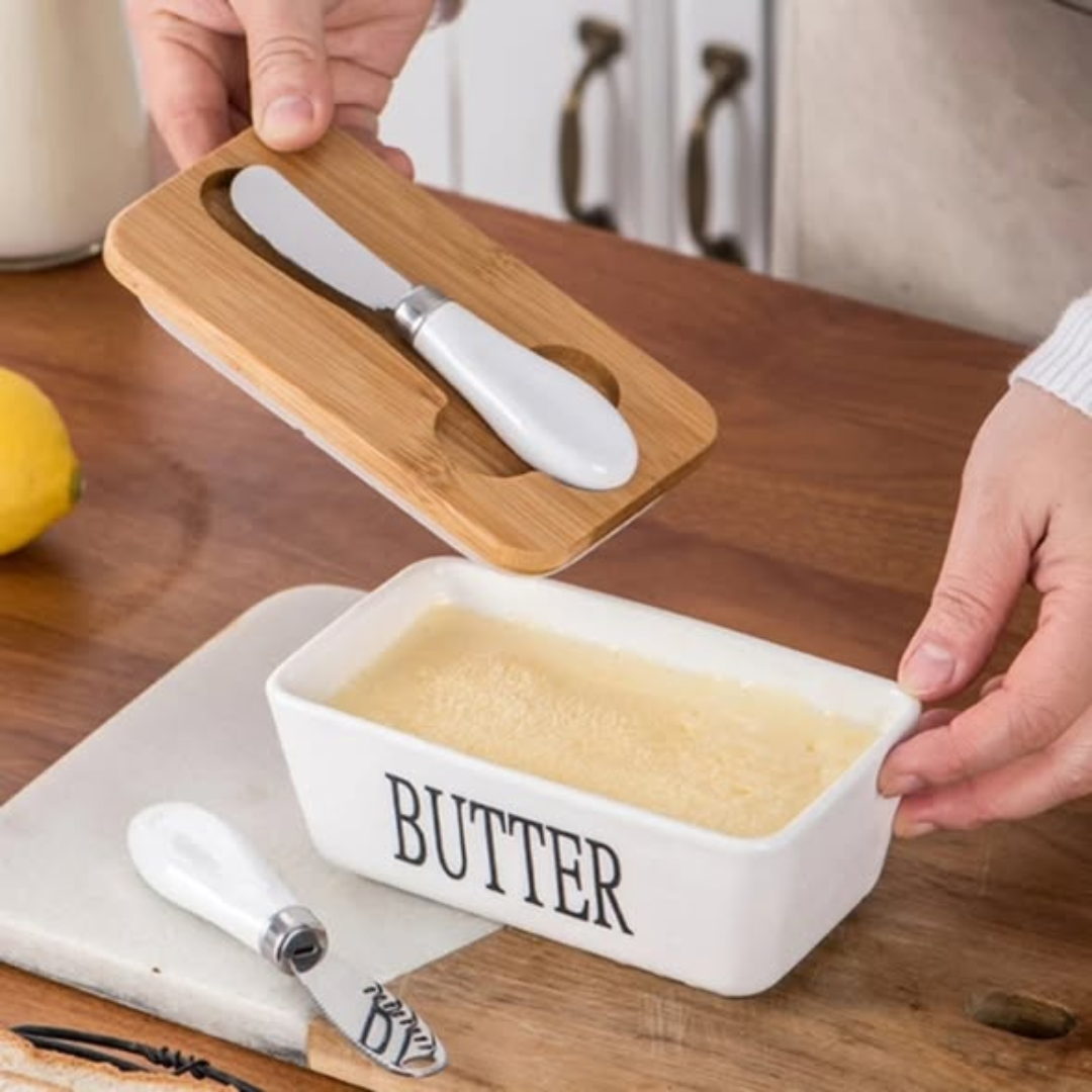 The Ceramic Butter Dish is as practical as it is stylish. The ceramic base is completely dishwasher safe, while the bamboo lid and knife can be easily cleaned with a quick rinse. Its sturdy construction ensures it stays in place on your counter or table, and the deep walls prevent the lid from touching the butter, keeping everything clean and tidy. If you are looking for a way to upgrade your morning routine and maintain the quality of your dairy products, this butter dish is the perfect choice for your home.