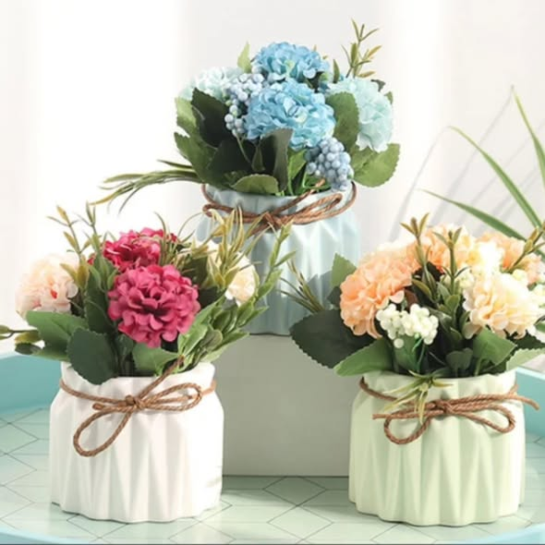 Complete Ready-to-Display Set: Includes a realistic hydrangea bouquet and a matching designer flowerpot.