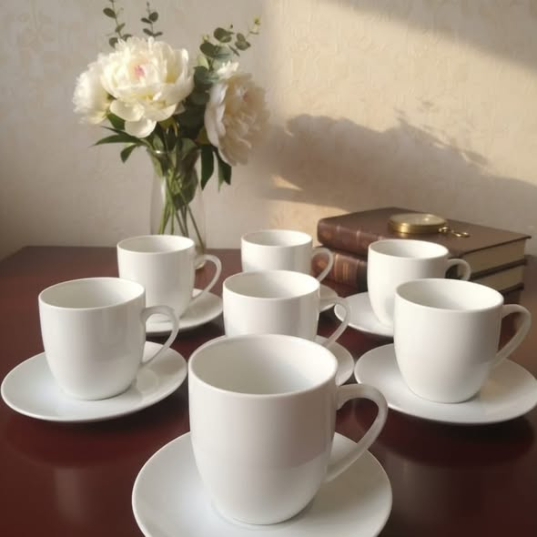 The Cup and Saucer White set is a classic staple that brings the refined atmosphere of a traditional tea house into the comfort of your home. This Cup and Saucer White collection, provided in a set of 6pcs, is designed for those who appreciate the simple beauty of pure white ceramic. With a 270ml capacity, each cup is perfectly sized for a generous serving of coffee, tea, or hot chocolate, ensuring your beverage stays warm while you enjoy it. The matching 6-inch saucers provide a stable place for your cup to rest, while also offering space for a small biscuit or a stirring spoon, protecting your table from heat and spills.