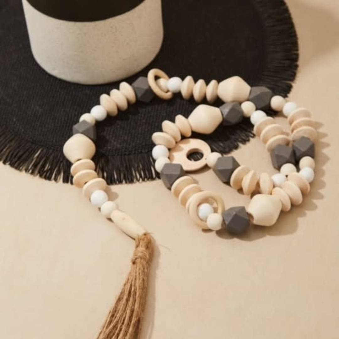 Handcrafted Aesthetic: Features natural wooden beads and a rustic tassel for a boho-chic look.