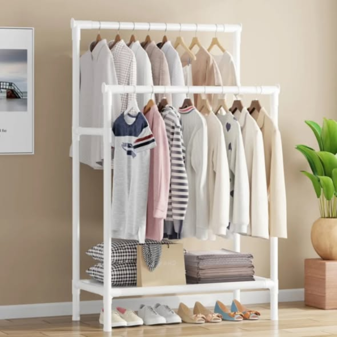 Organize your wardrobe with the versatile and sturdy Double Pole Floor Clothes Rack. A Double Pole Floor Clothes Rack is the ultimate storage solution for those who need extra hanging space without the permanence of a built-in closet. Featuring a multi-functional design, this rack provides two parallel hanging bars, effectively doubling your storage capacity for shirts, dresses, and coats. Its simple, modern aesthetic makes it a perfect addition to bedrooms, laundry rooms, or entryways, helping you keep your clothes neatly organized and wrinkle-free.