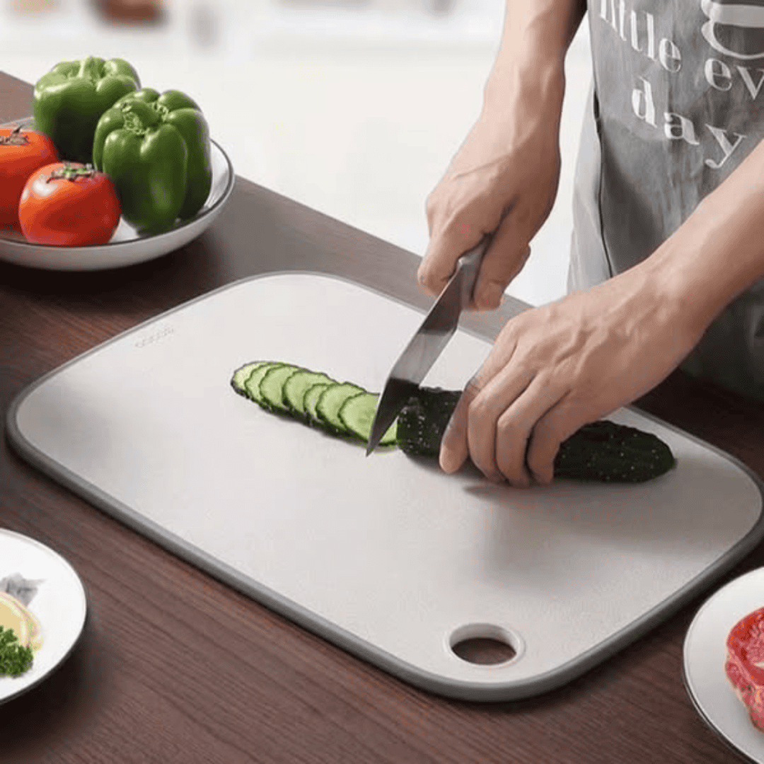 It comes in white and blue color options and is designed to resist cracking and warping. Perfect for cutting vegetables, fruits, meat, or bread, it features a smooth surface that’s easy to clean while being gentle on your knives. This chopping board is a perfect balance of eco-conscious design and everyday functionality.