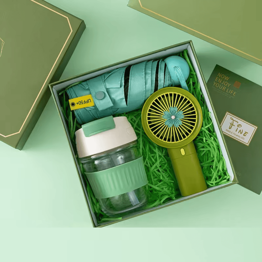 Stay Cool and Hydrated with the Stylish Fan Umbrella and Glass Bottle Gift Set