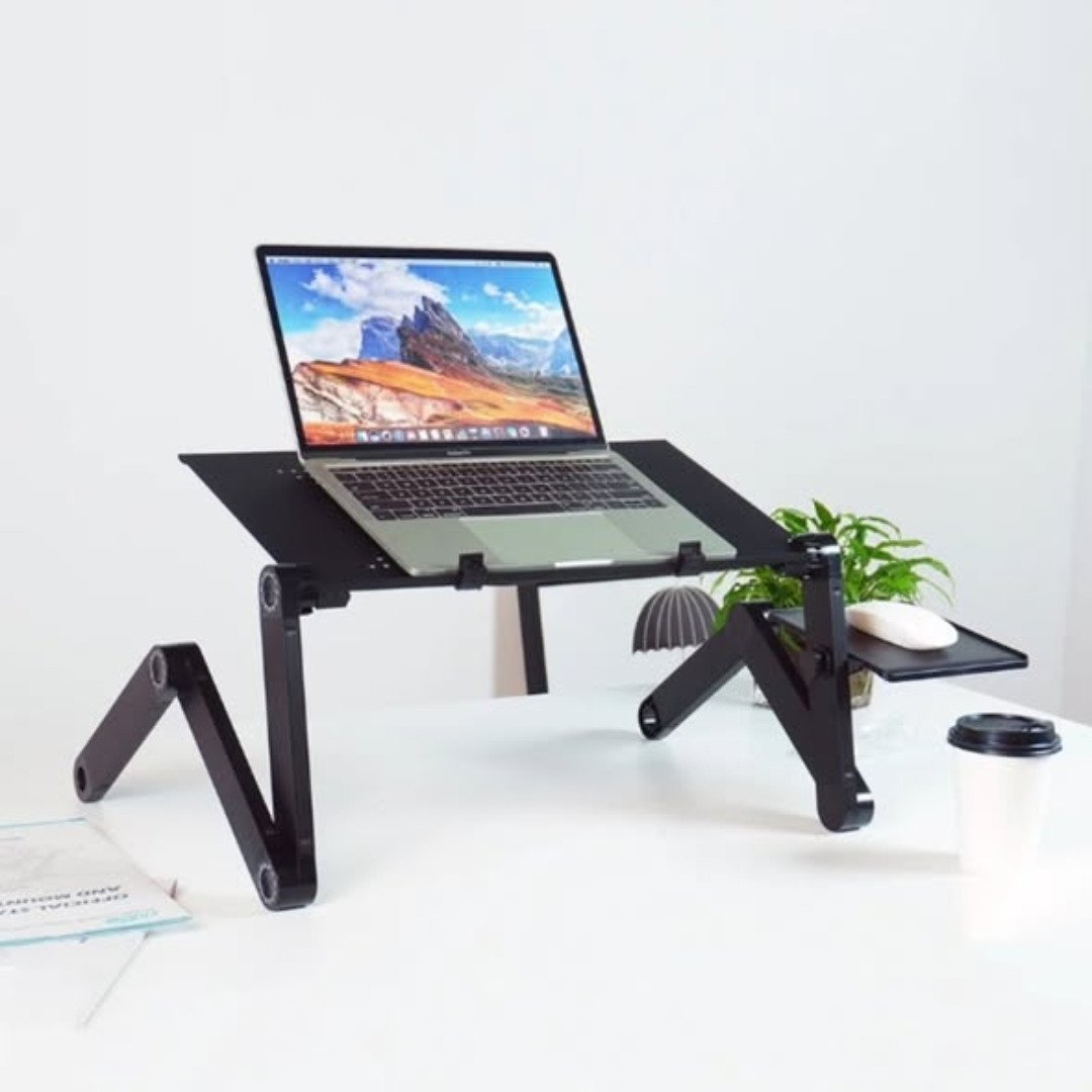 The Foldable metallic laptop stand is more than just a riser; it is a complete productivity station. This specific model comes “with mouse pad and fan,” ensuring your setup is both comfortable and your hardware remains cool. The integrated “fan” provides active cooling to prevent your laptop from overheating during intensive tasks like gaming or video editing, while the dedicated “mouse pad” area gives you a stable surface for precise navigation. This “metallic” construction is not only sleek but also helps with heat dissipation, acting as a passive cooling element for your device.