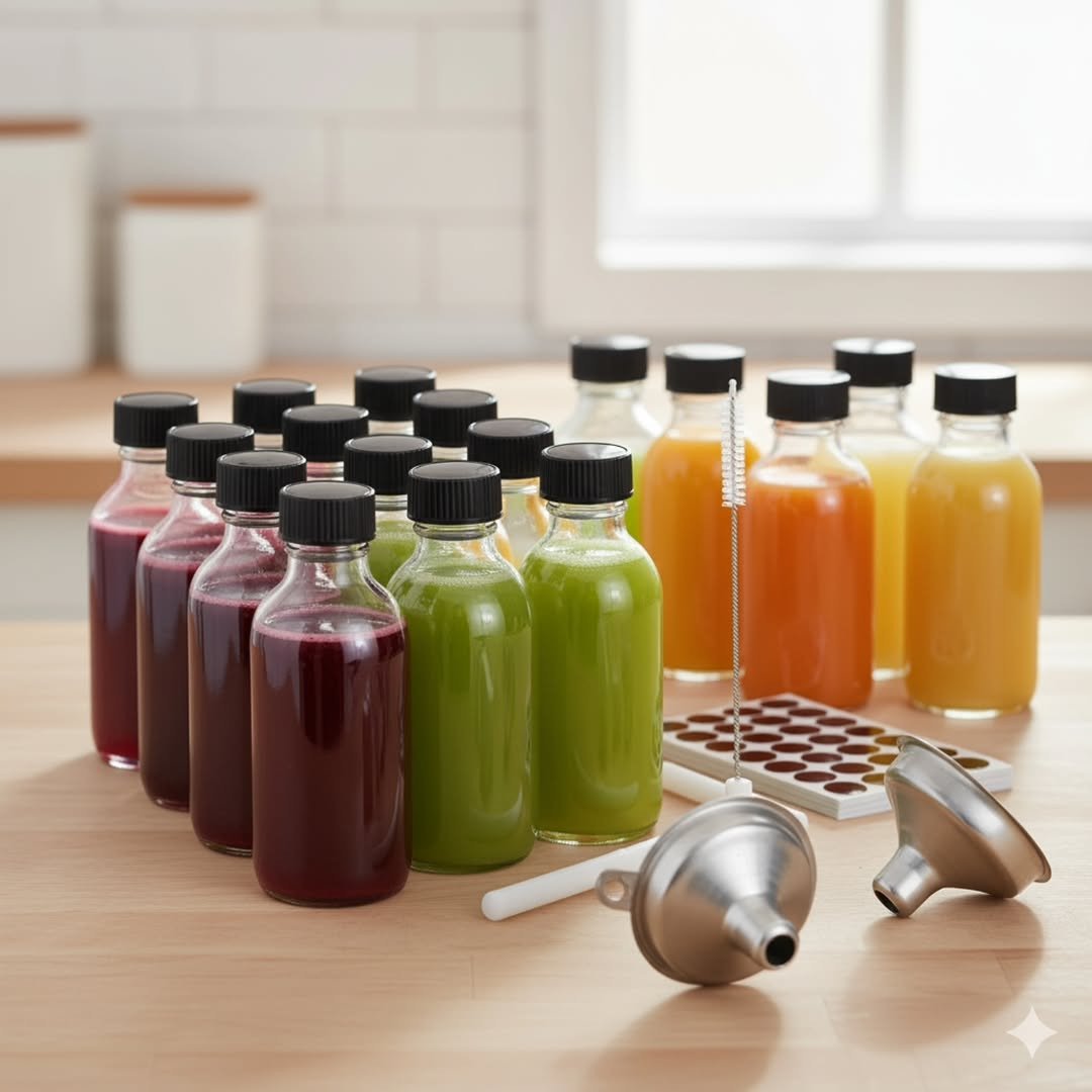 The Glass Ginger Shots Bottles set includes 12 high-quality glass bottles (60ml each), giving you enough capacity to prepare several days’ worth of shots in one session. The bottles are made from safe, reusable, BPA-free glass, ensuring your health drinks remain pure and untainted. Whether you enjoy ginger, turmeric, lemon, celery, wheatgrass, or mixed wellness concoctions, these bottles support a healthy, organized routine.