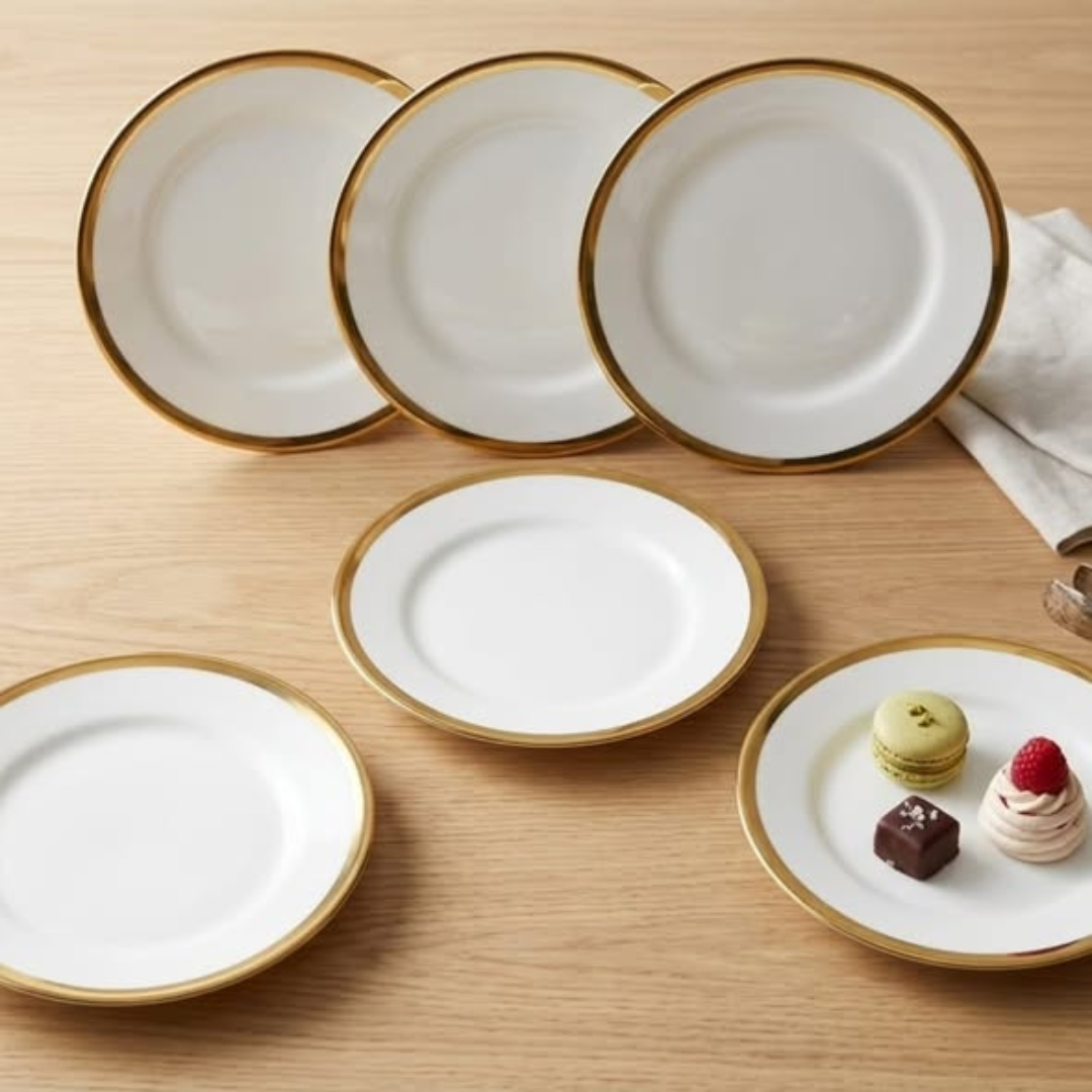 Choosing the Gold ring dessert side plate set means opting for a timeless style that complements a wide range of dinnerware. The 8-inch size is versatile enough to be used for side salads, bread rolls, or breakfast snacks, making it one of the most used items in your kitchen cabinet. The smooth ceramic glaze is resistant to stains and easy to clean, ensuring the white remains bright and the gold stays bold. With its perfect blend of “Elegant Dessert Side Plate” aesthetics and premium quality, this set is an essential upgrade for anyone looking to add a touch of gold-standard luxury to their snack time.