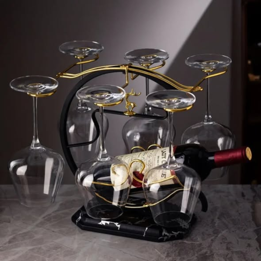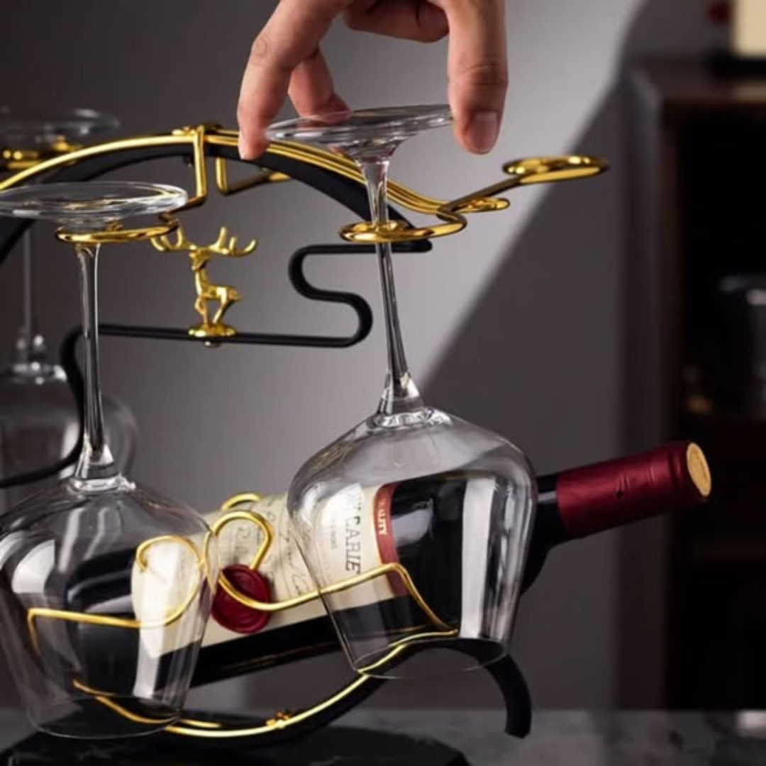 Add a touch of majestic luxury to your home bar or dining room with the stunning Golden Deer Wine Set Rack. This Golden Deer Wine Set Rack is a piece of functional art, featuring an intricate deer design that serves as a professional centerpiece for your beverage service. The Golden Deer Wine Set Rack is specifically engineered to hold 1 bottle in a secure slot and 6 wine glasses in elegant hanging slots, providing a coordinated and sophisticated look for your favorite vintage. Finished in a brilliant gold, this rack catches the light beautifully, making it the perfect addition to formal dinner parties and festive celebrations.