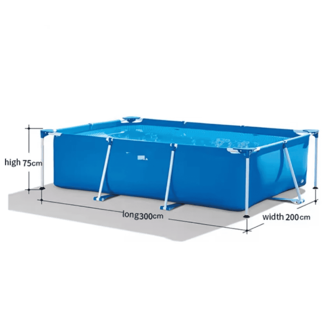With a size of 300 x 200 x 75 cm, the pool features a strong steel frame coated with rust-resistant material for long-lasting performance. The robust 3-layer laminated PVC walls provide superior strength and puncture resistance, ensuring your pool remains stable and secure during extended summer use.