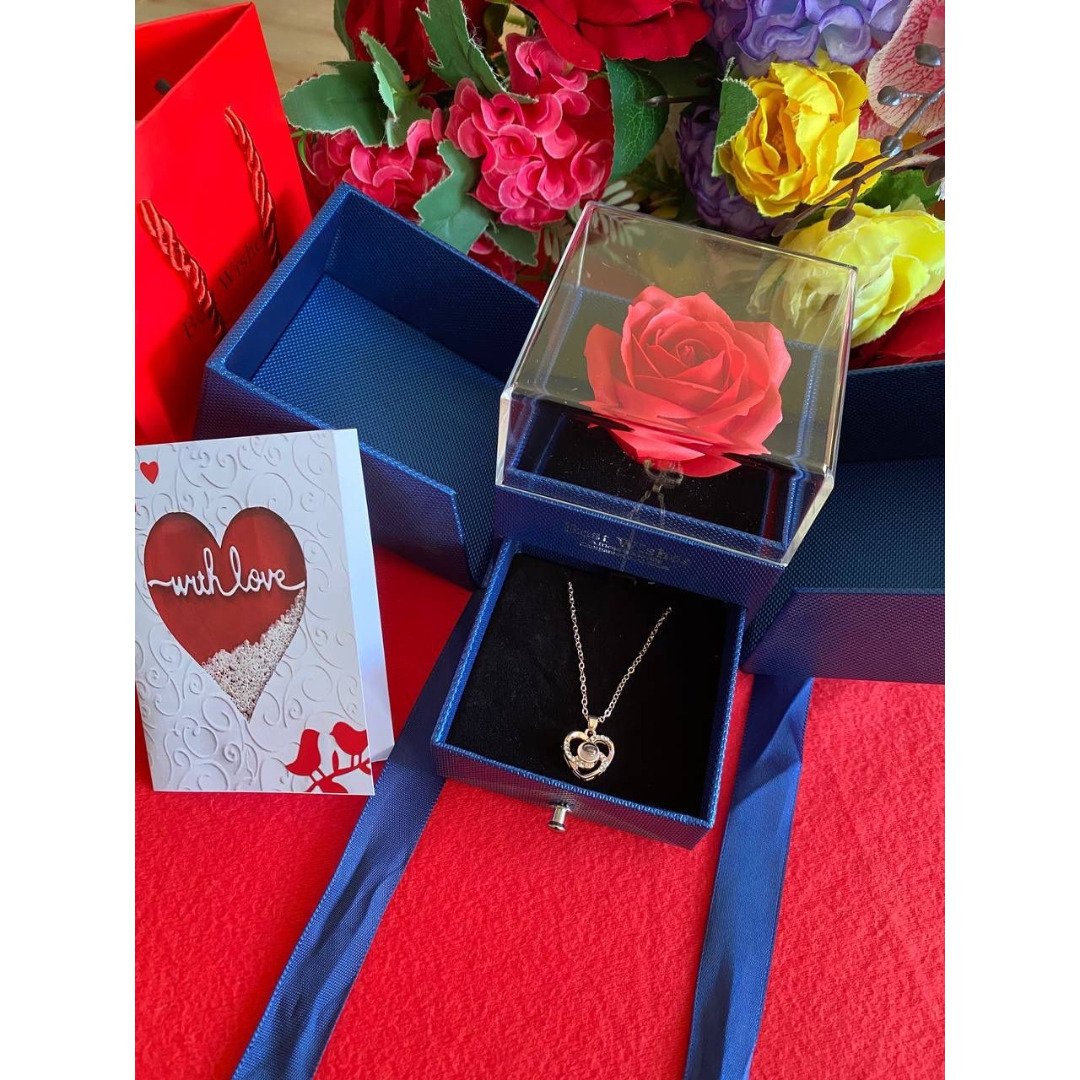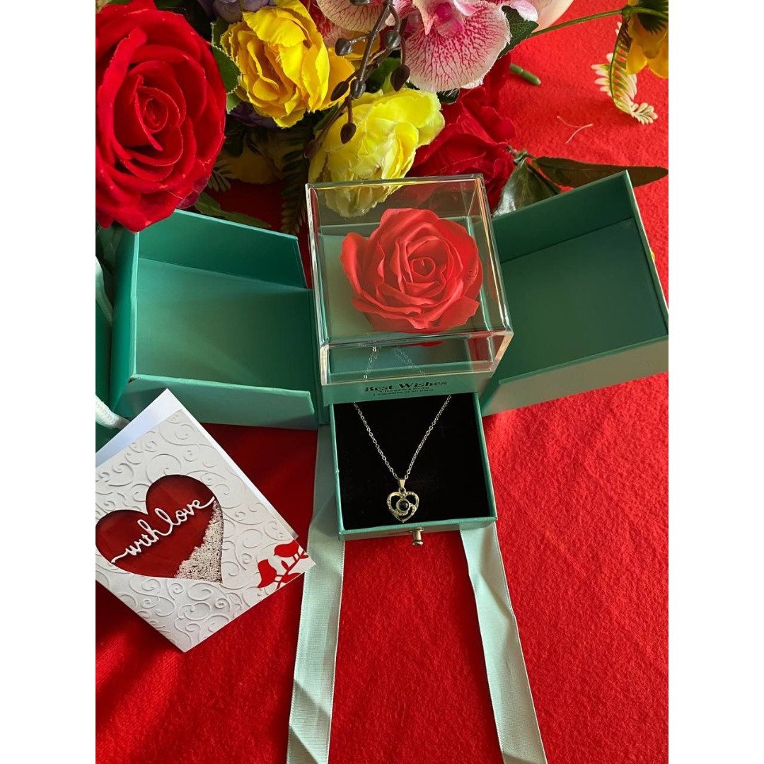 The centerpiece of this Ladies Gift Set is the preserved rose, which undergoes a special treatment to maintain its fresh-picked appearance for years without the need for water or sunlight. Tucked away in the sliding drawer below is a delicate necklace, providing a delightful “reveal” moment when she opens it. Whether it is for a birthday, a graduation, or an anniversary, this set provides a romantic and organized way to gift jewelry. Accompanied by a premium card and bag, it is a complete gifting solution that emphasizes luxury and thoughtfulness.