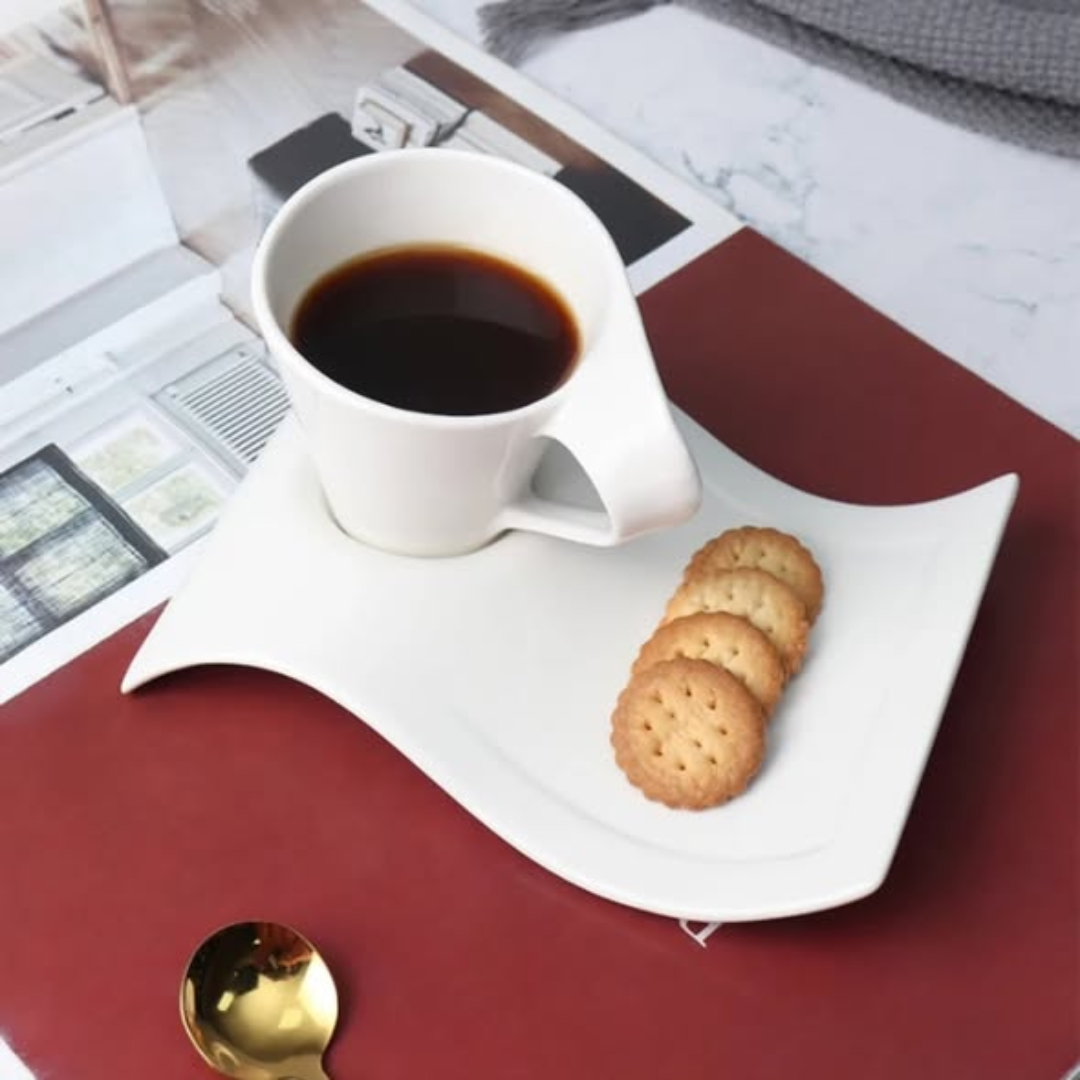 Artistic Swag Design: Features unique wavy saucers and modern cups for a standout look.