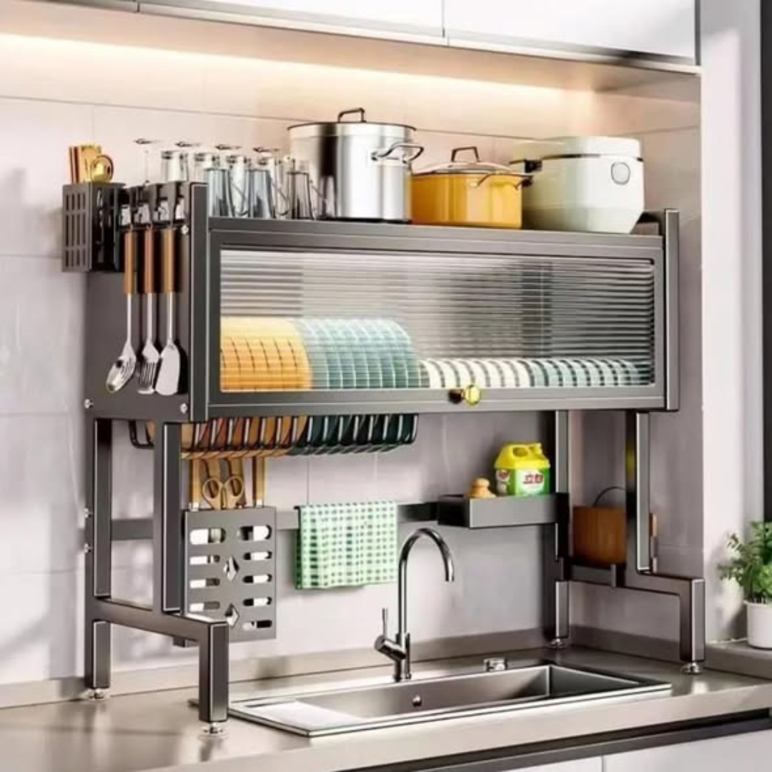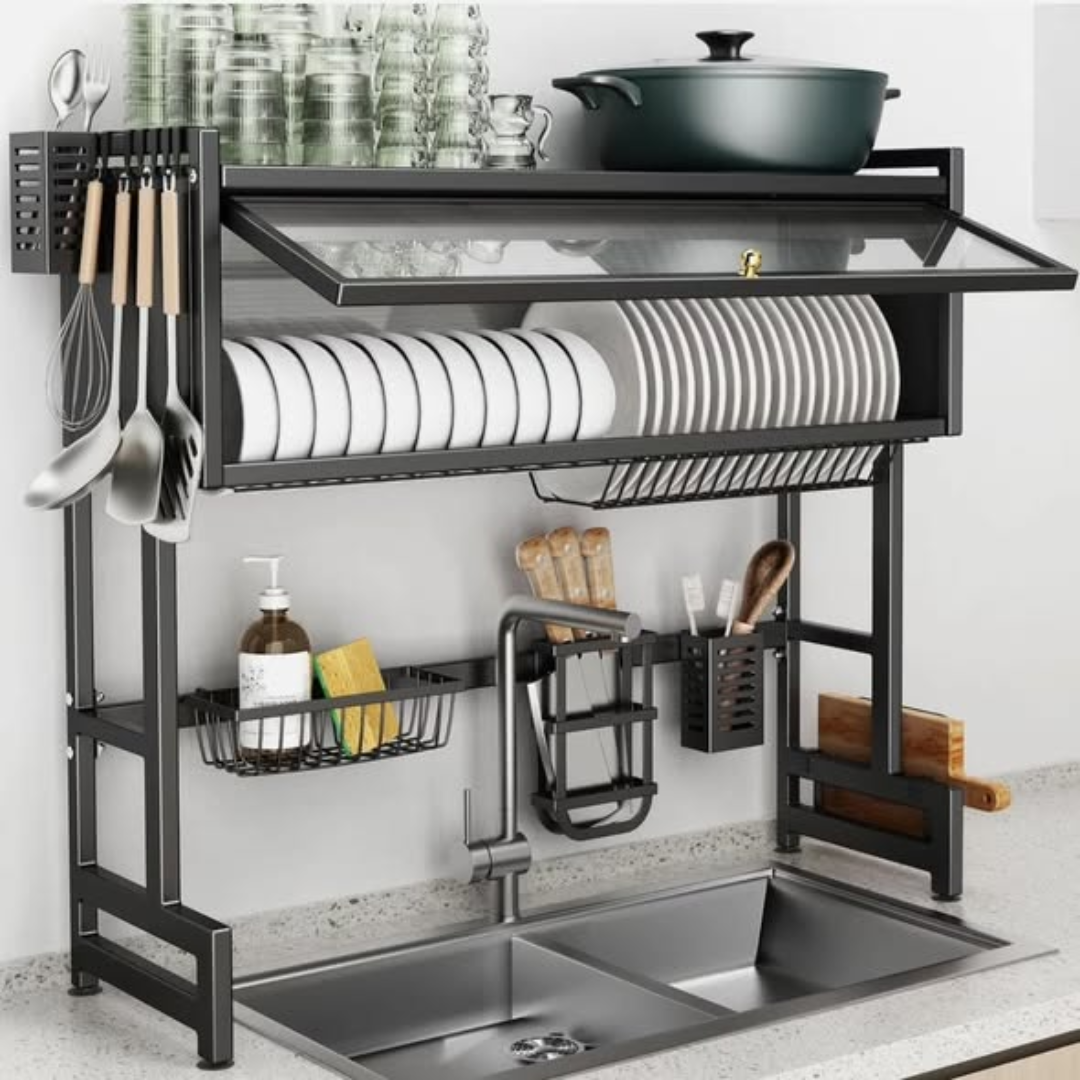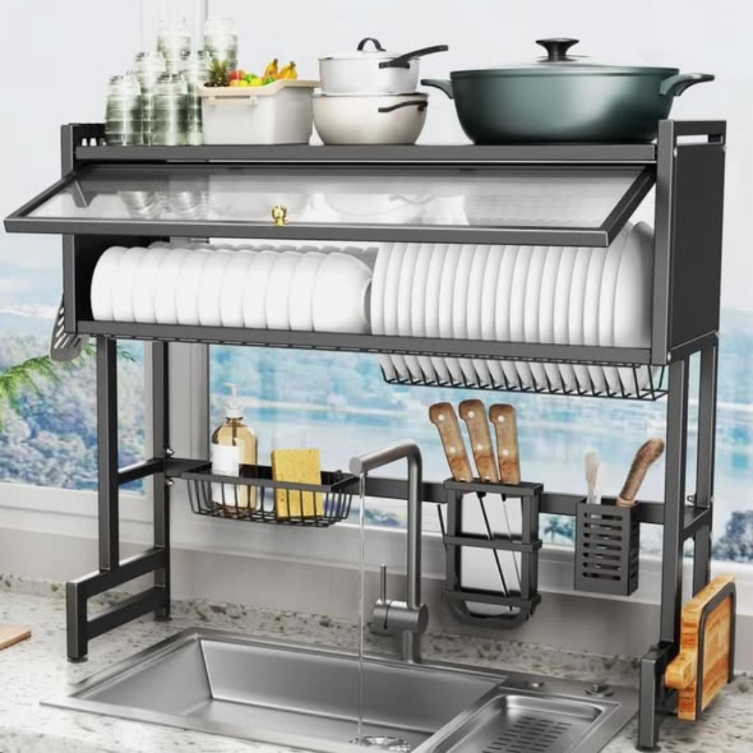 The Over the Sink Double Dish Rack is a revolutionary space-saver that utilizes the often-wasted vertical space directly above your kitchen sink. Available in 65cm and 85cm widths, this double-tier system allows water to drip directly into the sink, keeping your countertops dry and mess-free. This specific model features an integrated lid, providing a clean and dust-proof environment for your freshly washed dishes. Finished in a professional black coating, this rack is built to handle a full family set of plates, pots, and utensils while maintaining a sturdy, wobble-free stance.