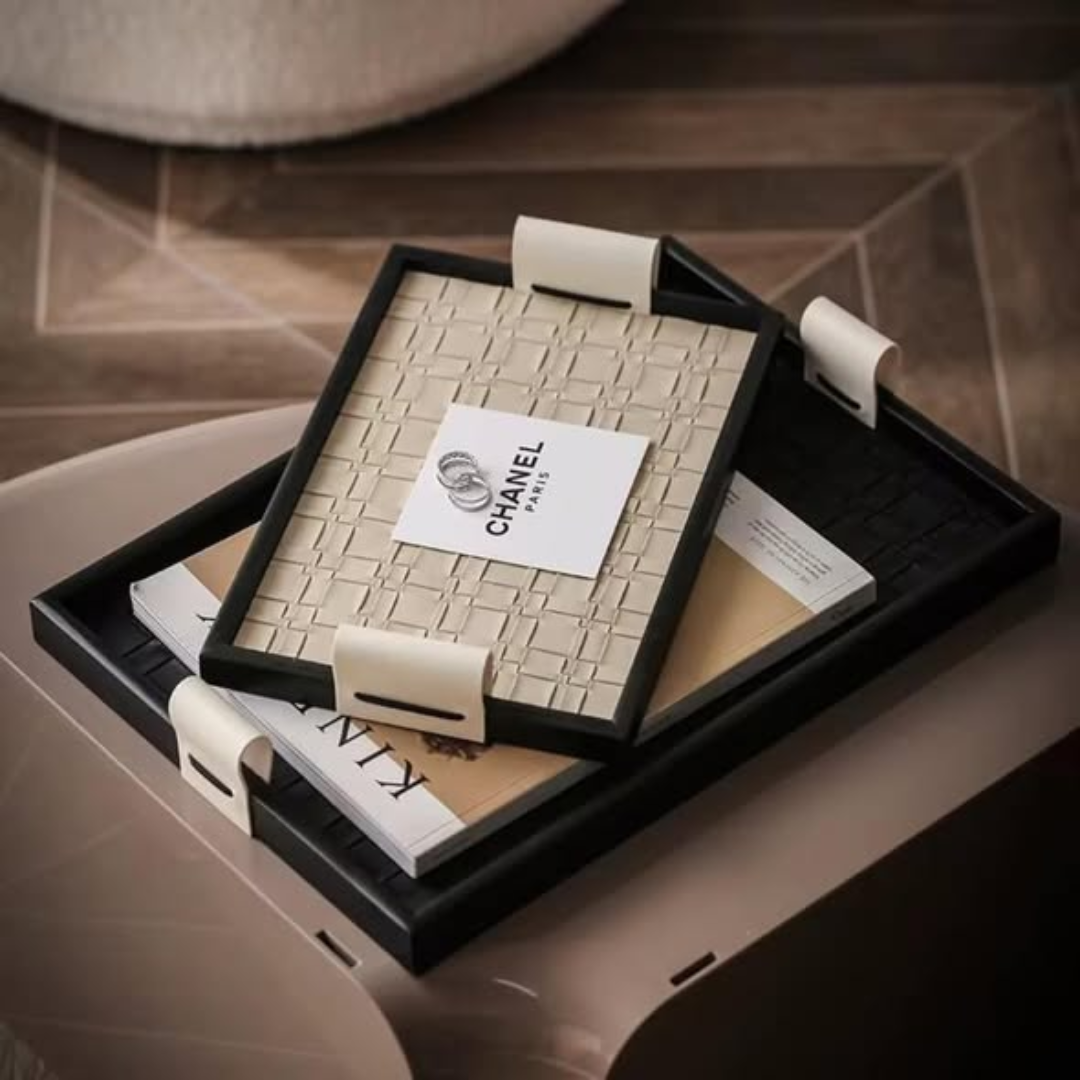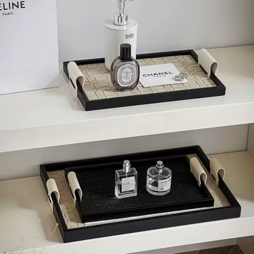 Our Perfume tray collection is designed to meet different space and storage needs, available in both Small and Big sizes. The small tray (30*20*2cm) is ideal for bedside tables or compact vanities, while the big tray (40*28*3cm) offers a sprawling surface for larger collections, makeup, or even jewelry. You can choose from chic colorways like classic black or a sophisticated nude with black accents to match your furniture. The low-profile rim ensures that your items are contained while remaining easily accessible for your daily grooming routine.