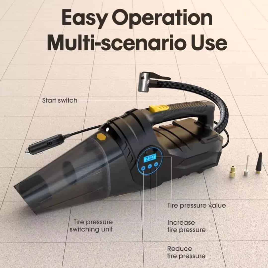 The Portable Car Tyre Inflator and Vacuum Cleaner Dual Use is the ultimate two in one car accessory designed to keep your vehicle clean, safe, and ready for any journey. Combining a powerful handheld vacuum with a high-performance tyre inflator, this compact device brings unmatched convenience to your car care routine. Whether you need to remove dirt and dust from your car interior or inflate a low tyre during emergencies, this tool ensures you always stay prepared. With its durable ABS and alloy build and 12V power operation, it guarantees reliability whenever you need it most.