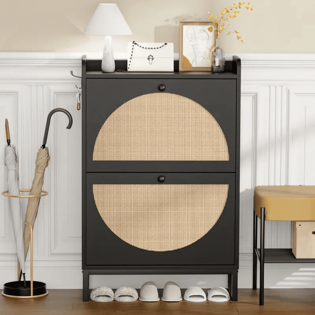 Bring order and elegance to your home with this rattan wooden black shoe cabinet—a sophisticated blend of style and practicality.