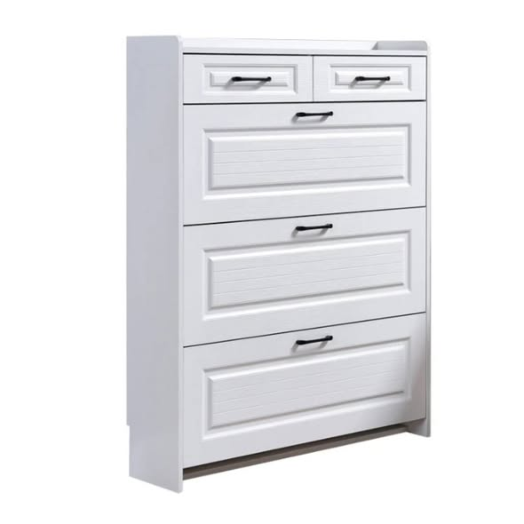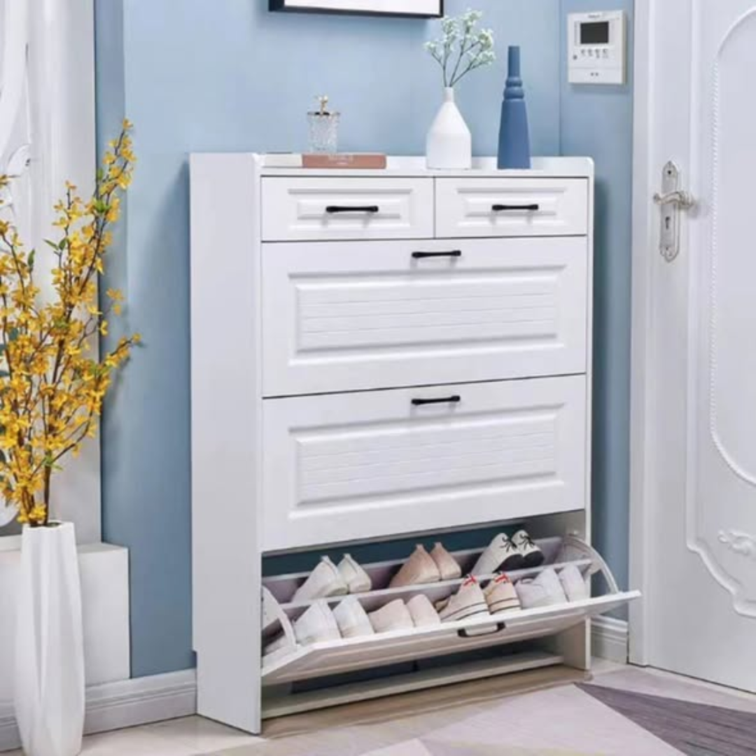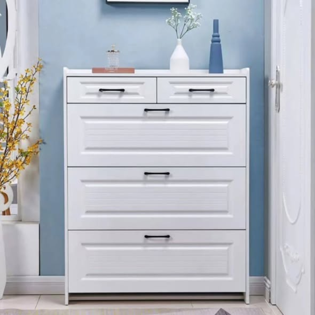 Organize your entryway and transform your hallway with our sleek and functional Shoe Cabinet. If you are tired of cluttered floors and scattered footwear, the Shoe Cabinet offers a professional and modern solution that keeps your home looking tidy and spacious. This 4-tier wood white flip down shoe rack is specifically designed to fit into narrow spaces, making it the perfect narrow shoe storage organizer for apartments, small hallways, or busy living rooms. Featuring 3 flip-down doors and 2 additional drawers, this Shoe Cabinet provides a massive amount of storage for your entire collection while maintaining a slim and elegant profile.