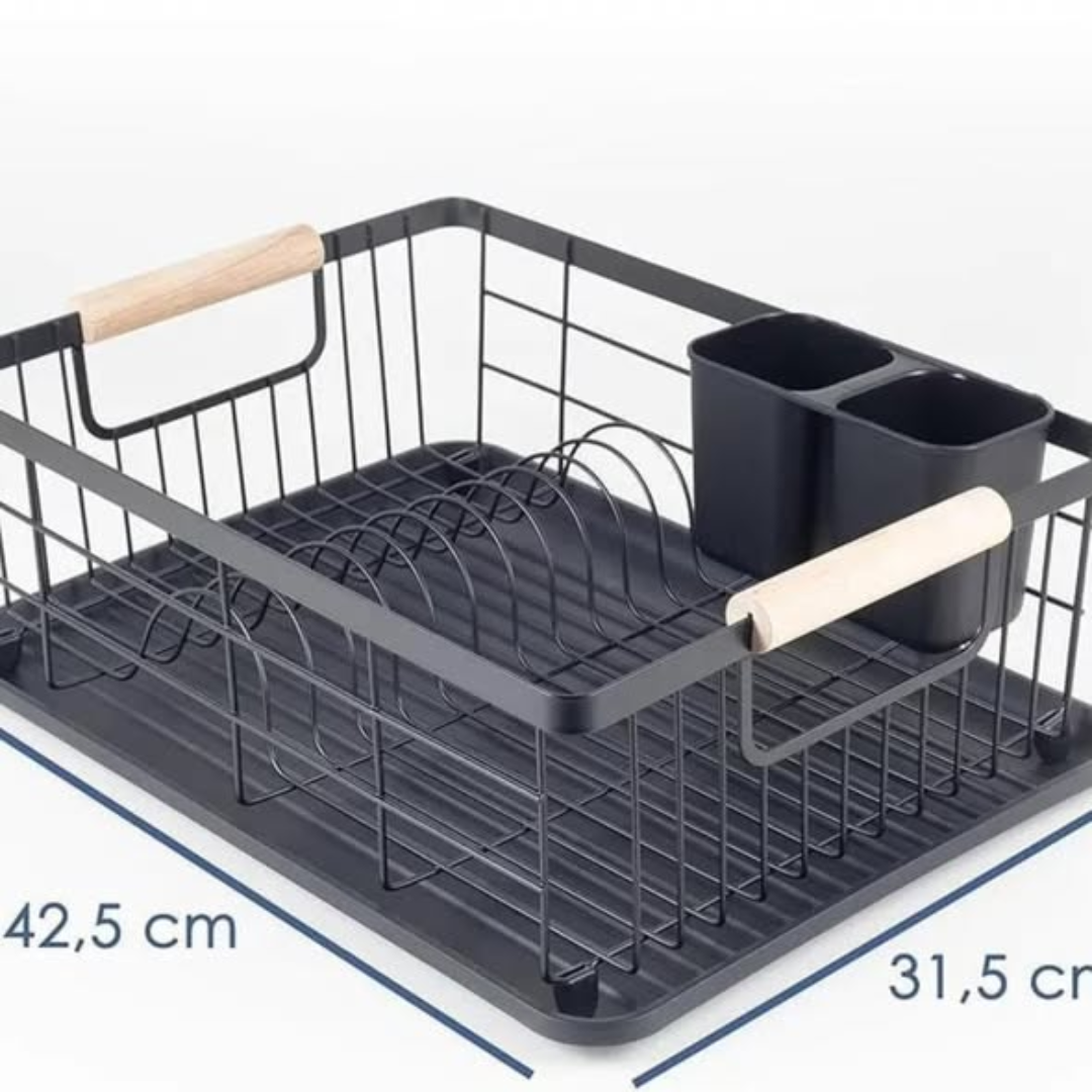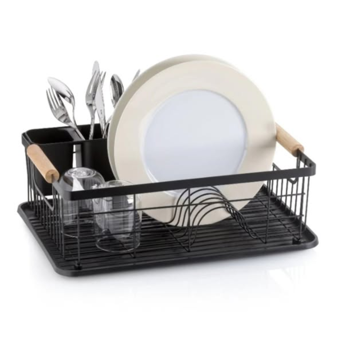 Organization is at the heart of this design, featuring a specialized cutlery holder that keeps your spoons, forks, and knives separate and upright for faster drying. The carbon steel construction provides a stable and secure base that won’t wobble under the weight of heavy ceramic plates. With its professional black finish, this dish rack doesn’t just hold your dishes; it serves as a contemporary accessory that fits perfectly into a well-organized, “light luxury” kitchen. It is the ideal solution for those who value durability and minimalist design in their daily chores.