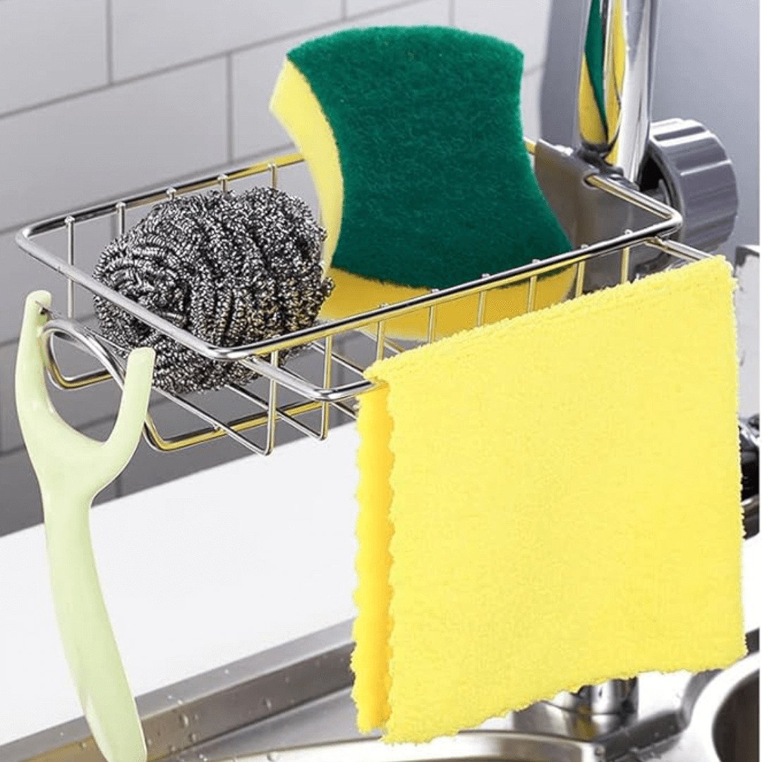 3-in-1 Storage: Includes a spacious basket for sponges, a built-in rail for dishcloths, and a handy hook for brushes or vegetable peelers.