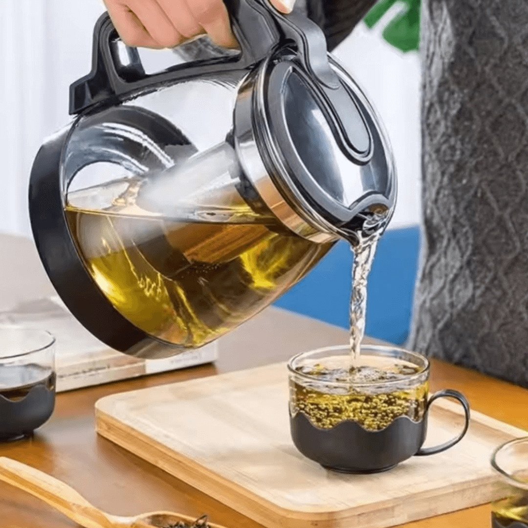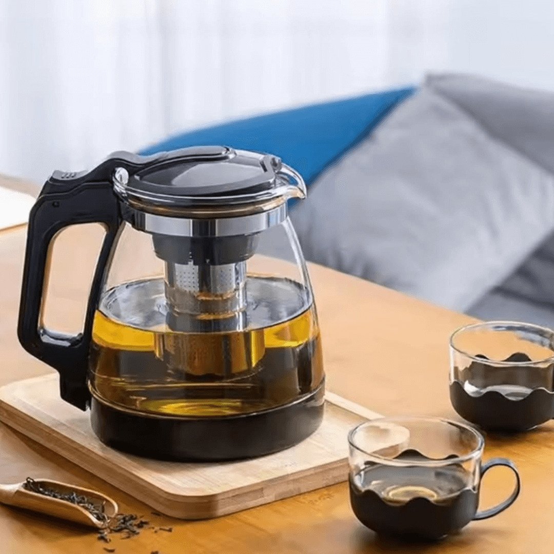 Premium Borosilicate Glass Tea Decanter with Fine Mesh Sieve – Heat-Resistant Glass Teapot with Ergonomic Black Accents