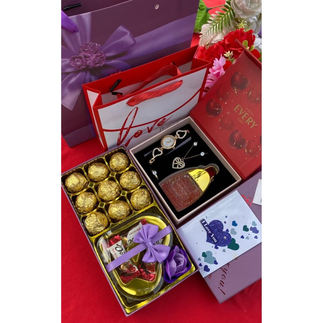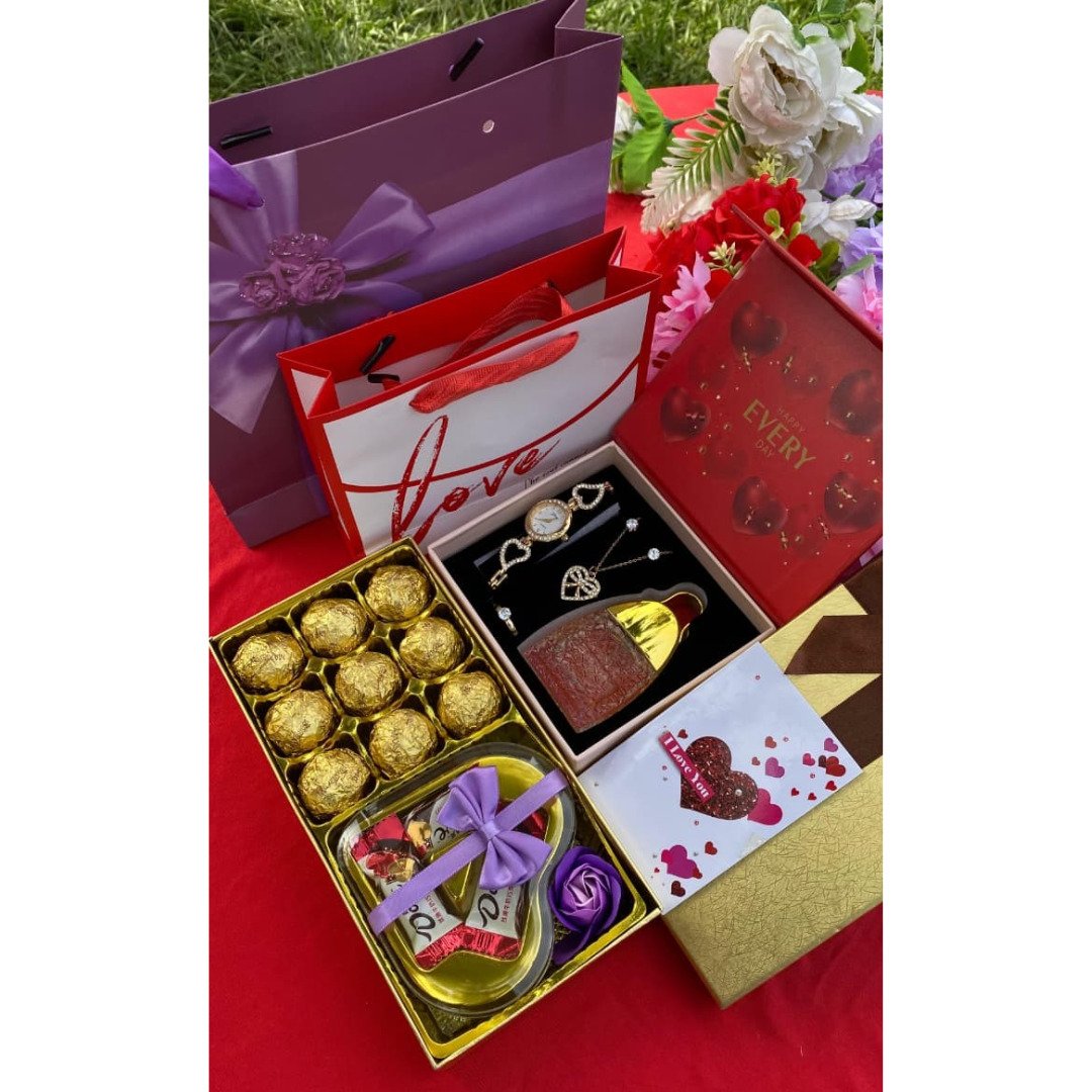 This set is designed for the woman who wants it all—from the indulgence of gourmet chocolates to the luxury of a full jewelry suite and a signature scent. The perfume and jewelry work together to create a stunning evening look, while the chocolates provide an immediate treat for her to enjoy. The Valentines Ladies Gift Set Premium Choice is the ultimate way to show your appreciation on a grand scale. With the included gift card, you can tie the whole experience together with a heartfelt note, making it a Valentine’s Day she will never forget.