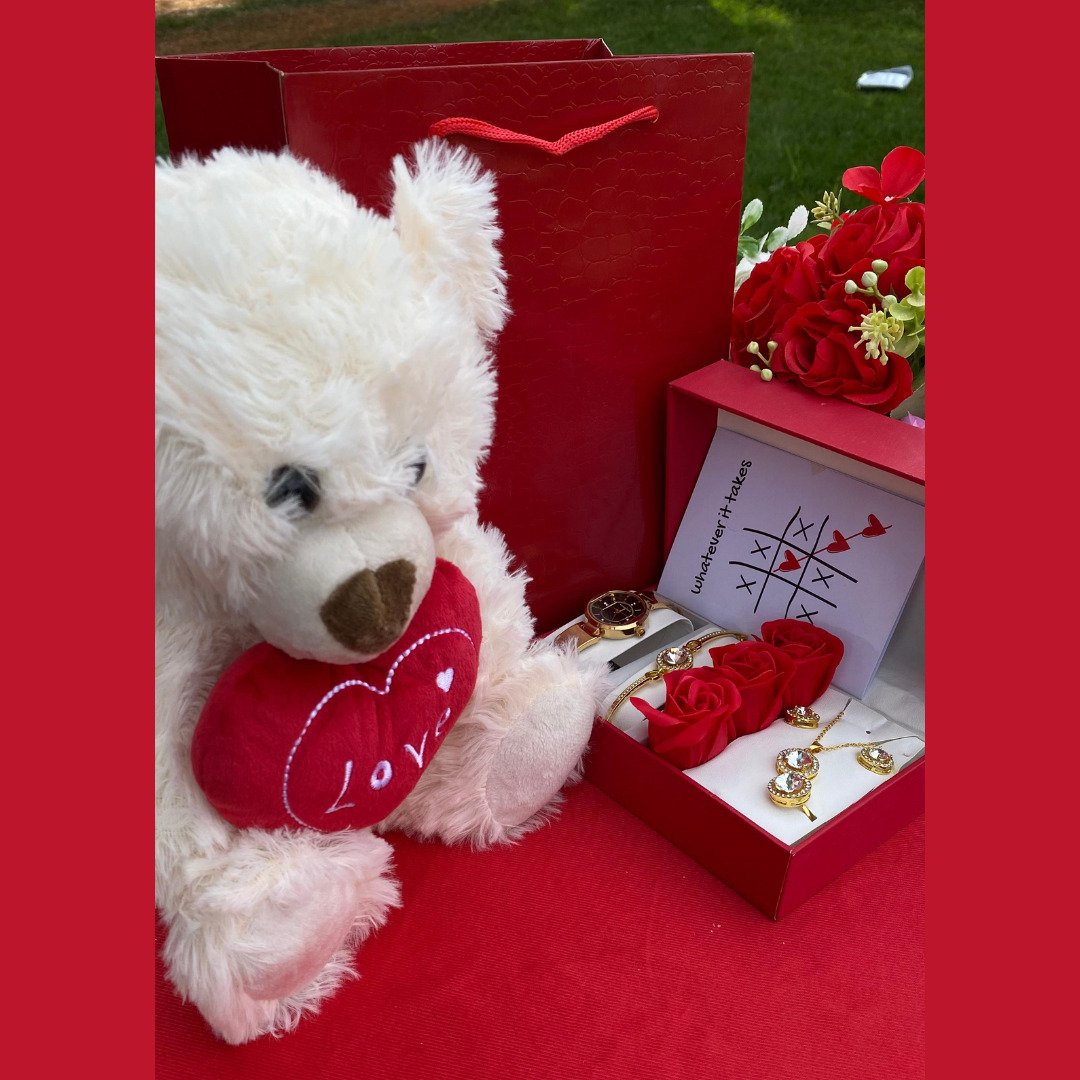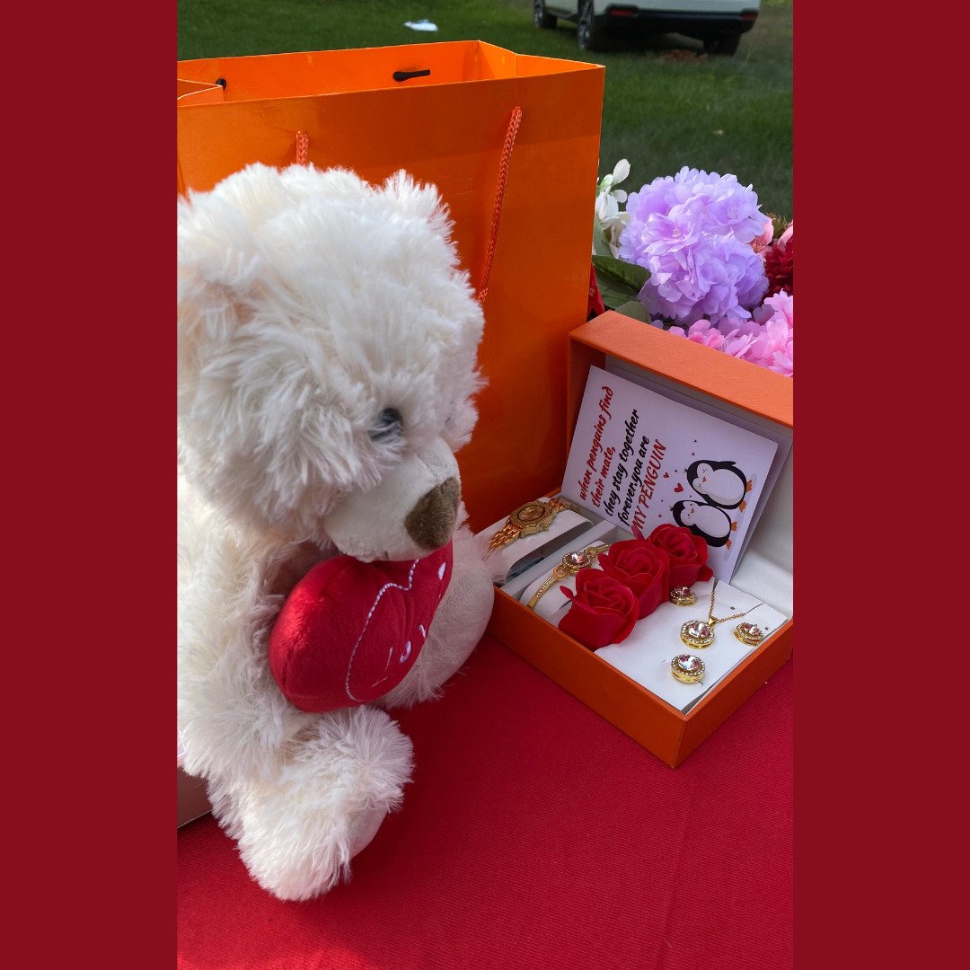Make her day with the Valentines Ladies Gift Set Deluxe featuring jewelry and a teddy bear. Order this complete set in Nairobi!