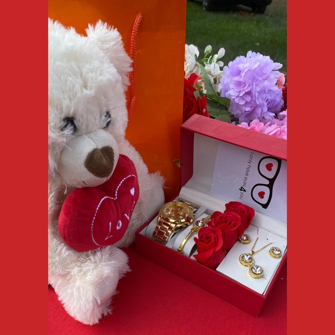 The jewelry components—the watch, bracelet, necklace, earrings, and ring—ensure she is covered in elegance from head to toe. The plush teddy bear provides a soft, sentimental keepsake, while the included rose petals allow you to decorate a room or table for a romantic surprise. Packaged with a card and bag, the Valentines Ladies Gift Set Deluxe is the ultimate “all-in-one” Valentine’s solution. It takes the stress out of planning by providing every element of a classic romantic gesture in one high-quality box.