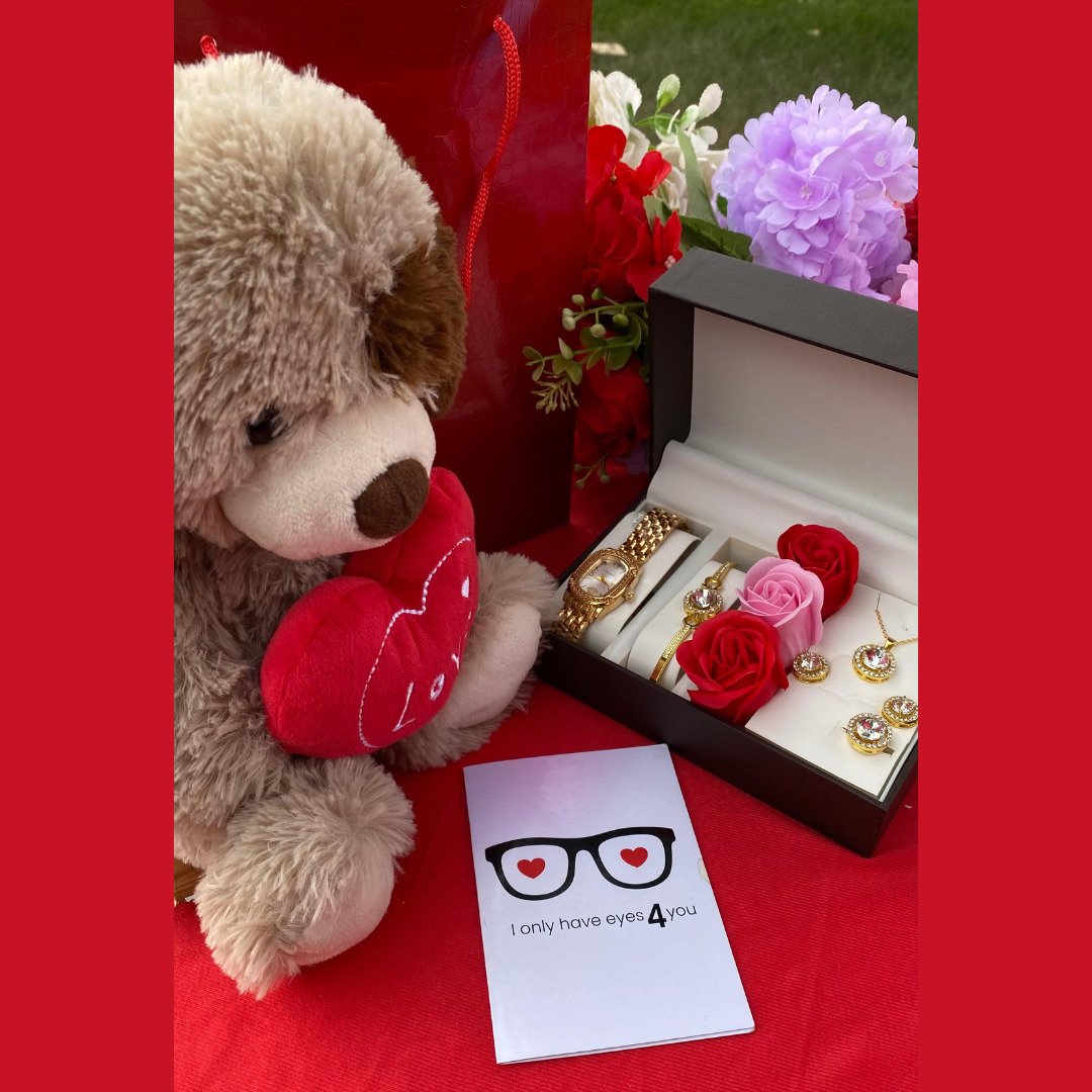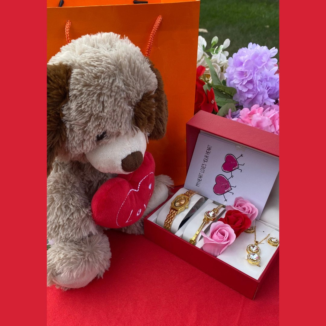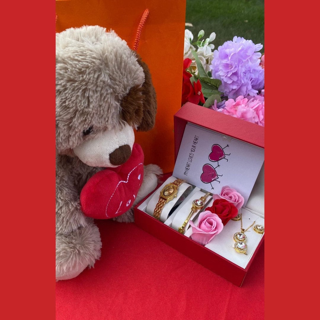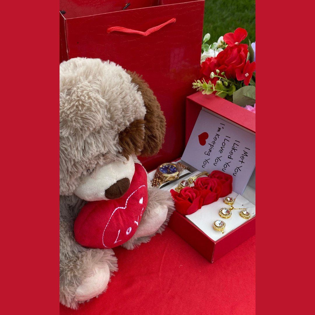 For a truly romantic and comprehensive surprise, the Valentines Ladies Gift Set Deluxe offers everything needed to make her feel cherished. This Valentines Ladies Gift Set Deluxe is a massive collection including a teddy bear, watch, bracelet, necklace, earrings, ring, and even rose petals for a romantic setup. It is designed to create an entire “moment” rather than just a simple exchange of gifts, providing a full sensory experience.