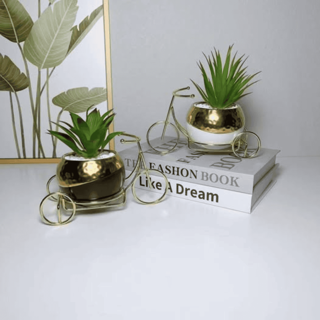 Perfect for living rooms, balconies, patios, and even office spaces, this vintage-inspired piece combines natural elements with artistic design. The ceramic pot provides durability and sophistication, while the gold bike stand adds a playful yet luxurious touch. The artificial flower requires no maintenance, ensuring your space always looks fresh and inviting. With the included white stones, this planter becomes a ready-to-display centerpiece.