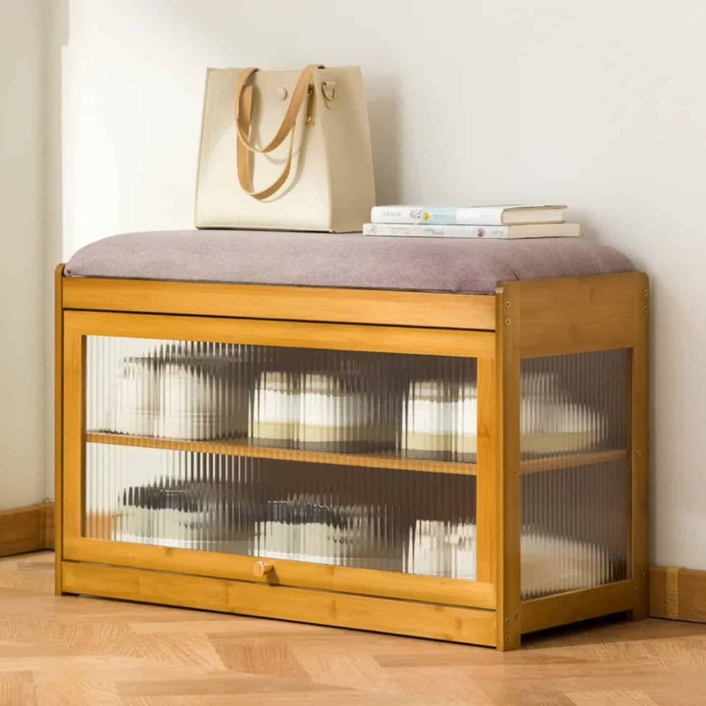 Dual-purpose design: seating stool and shoe storage cabinet in one.
